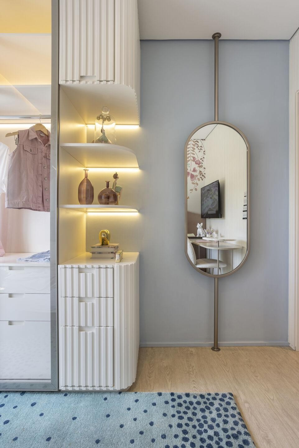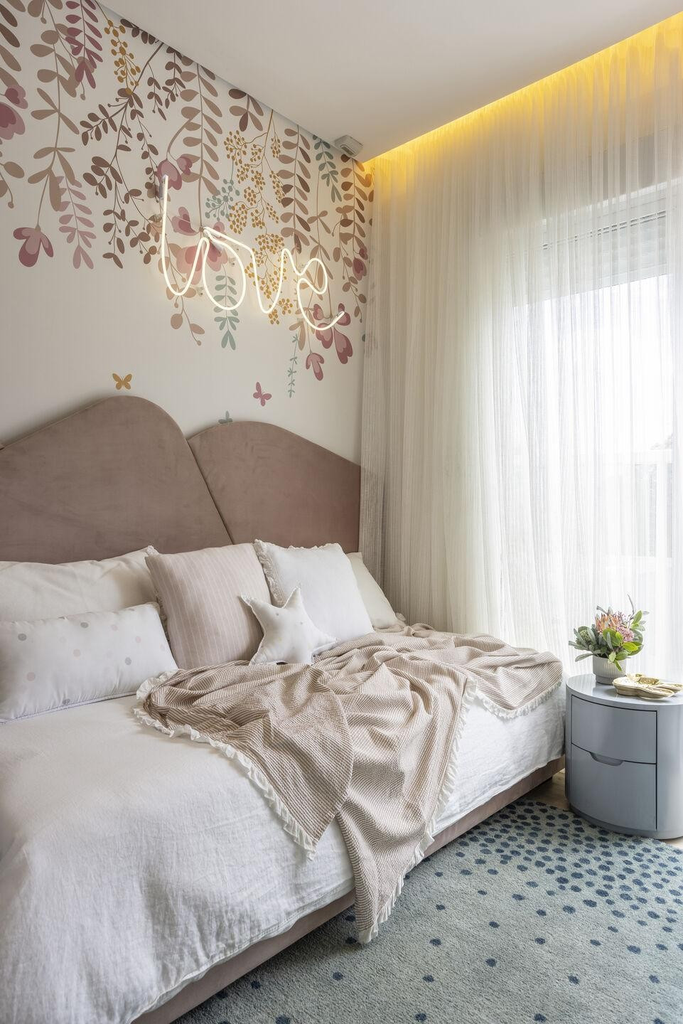 Nếu tầng trệt là không gian của kết nối, giao lưu và sinh hoạt chung, thì tầng trên là thế giới riêng được “đo ni đóng giày” cho từng thành viên. Phòng bé gái sử dụng bảng màu xanh lá, xanh dương dịu nhẹ, điểm xuyết các gam ấm, gợi cảm giác như một khu vườn nhỏ. Mảng tường vẽ hoa lá, đèn trang trí mềm mại, kệ tủ cao kịch trần với những đường cong uyển chuyển và gương tròn tạo nên không gian nữ tính, trong trẻo, đầy cảm xúc.