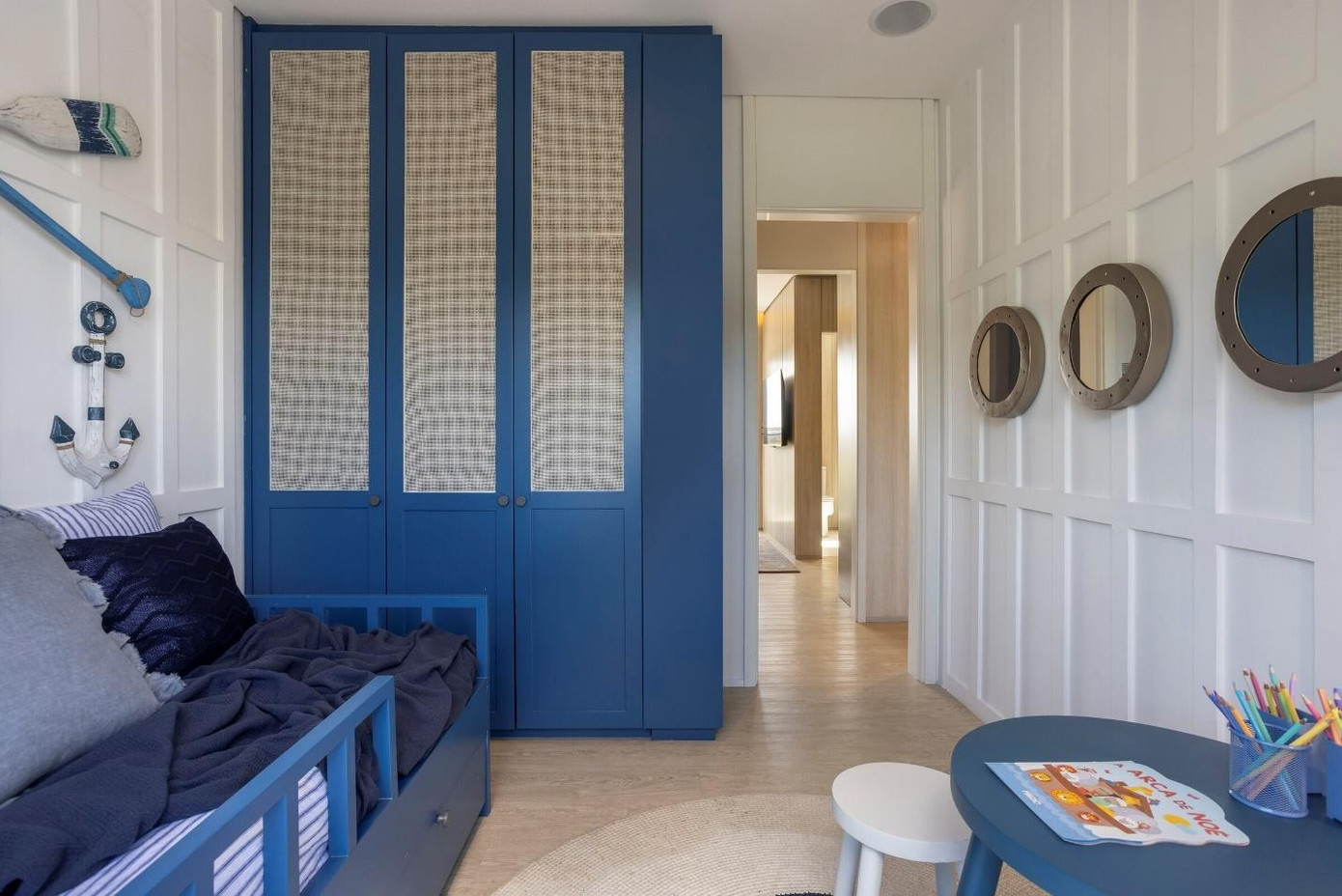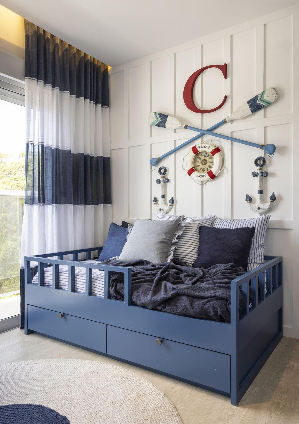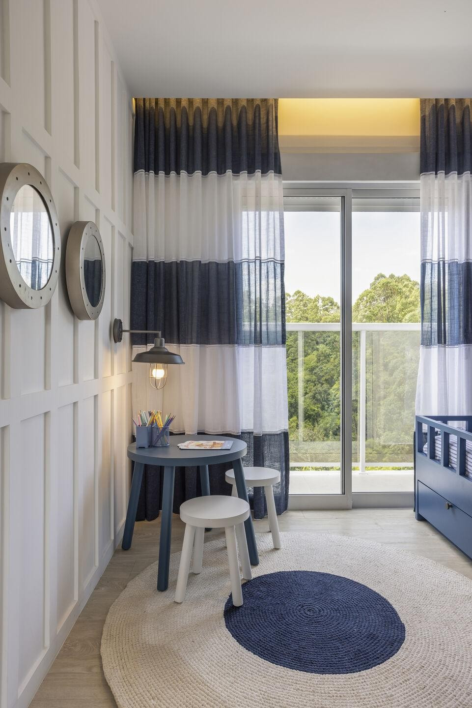 Phòng bé trai mang chủ đề hàng hải, rộng rãi và tràn ngập ánh sáng, kết nối trực tiếp với sân thượng, mở ra một không gian linh hoạt cho học tập, đọc sách và vui chơi. Nội thất được bo tròn, không góc cạnh, đảm bảo sự an toàn nhưng vẫn giữ được tính thẩm mỹ hiện đại.