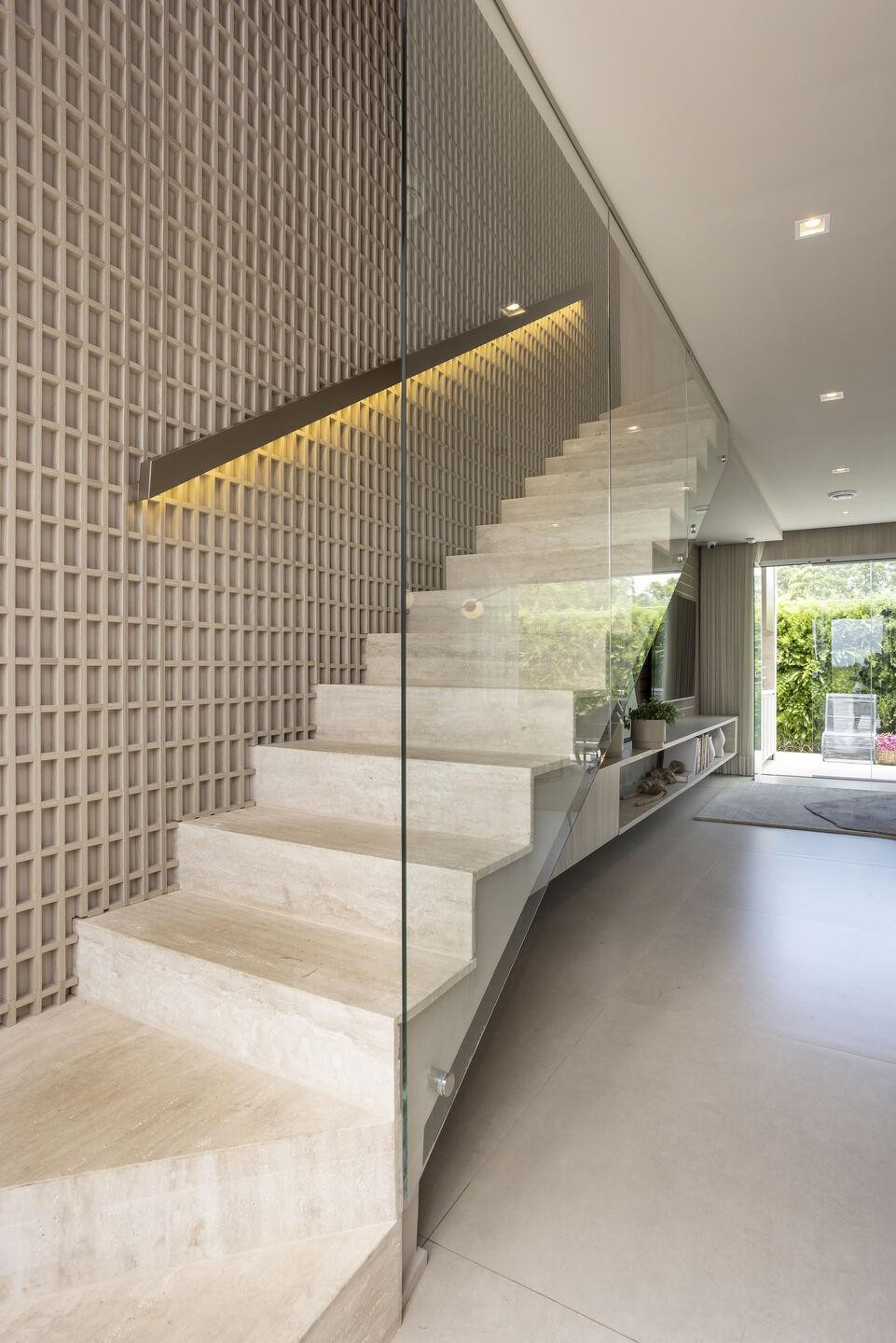 Ở trung tâm ngôi nhà, cầu thang được thiết kế như một tác phẩm điêu khắc không gian với khung kính trong suốt, tay vịn gỗ sáng và các bề mặt hoàn thiện liền mạch. Lan can kính giúp không gian luôn thông thoáng, tạo cảm giác nhẹ nhàng, tinh khiết. Hệ cửa ẩn và các chi tiết nội thất tối giản tiếp tục củng cố ngôn ngữ thiết kế hiện đại, nhưng không hề lạnh lẽo, bởi sự hiện diện xuyên suốt của gỗ và ánh sáng tự nhiên đã làm mềm mọi đường nét.