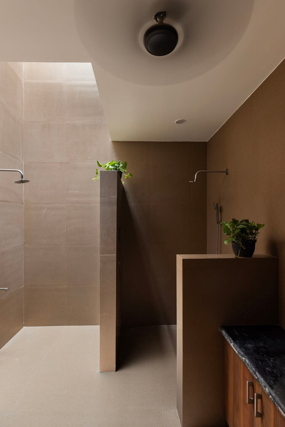 Các khoảng thông tầng được bố trí chiến lược tại sảnh vào, bên cạnh khu ăn uống, dọc cầu thang và trong phòng tắm tầng một. Ảnh: Purnesh Dev Nikhanj