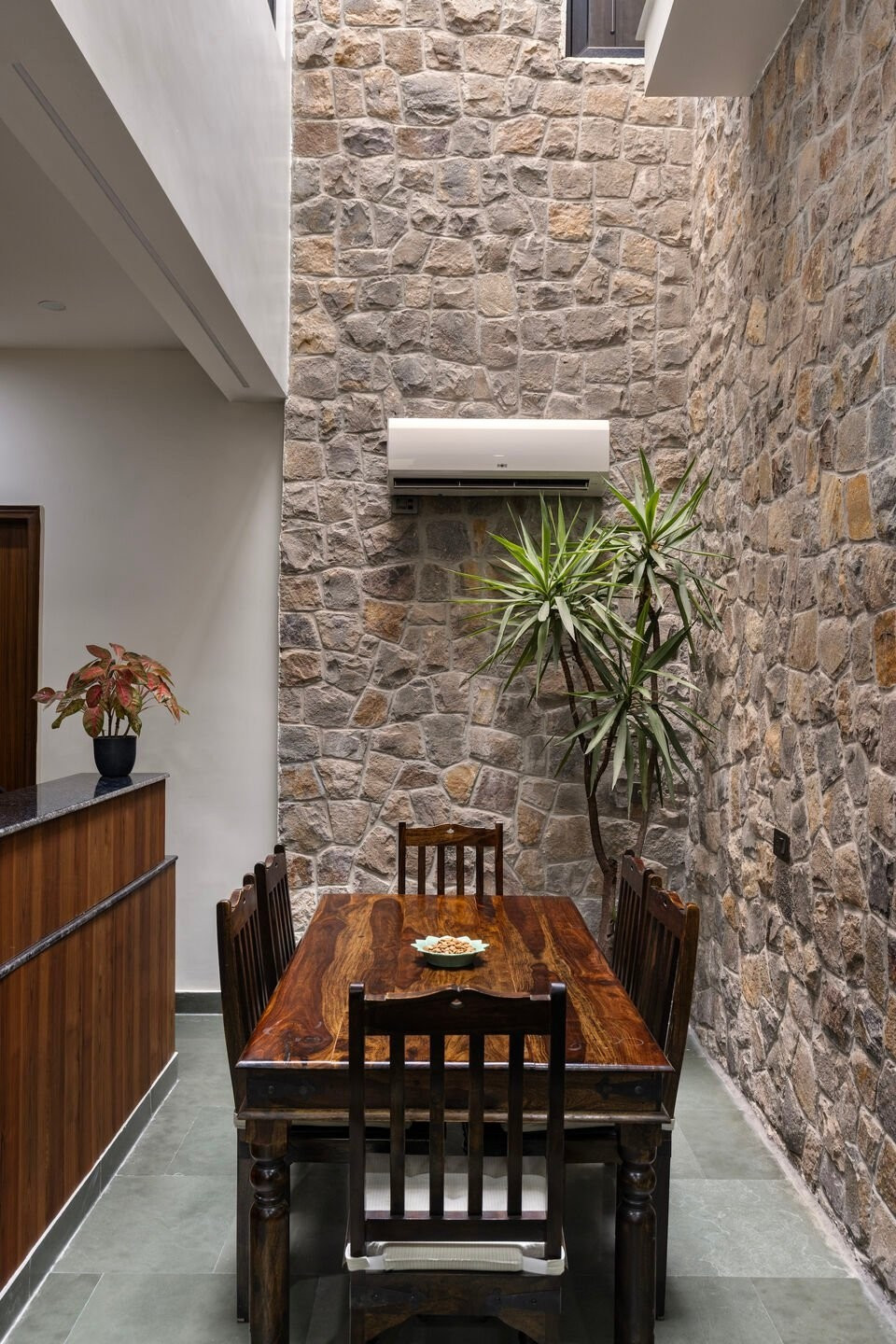 Do diện tích xây dựng không quá lớn, khoảng lùi rộng nên kiến trúc sư thiết kế 4 khoảng thông tầng giúp mang ánh sáng và gió tự nhiên vào bên trong. Ảnh: Purnesh Dev Nikhanj