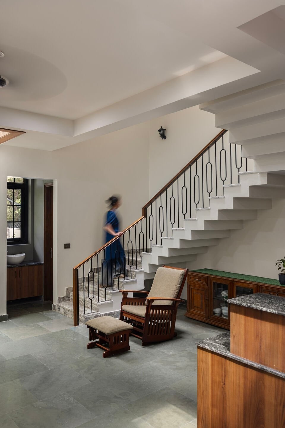 Cầu thang trung tâm cùng giếng trời liền kề tạo sự lưu thông theo chiều dọc, đảm bảo ánh sáng và tầm nhìn xuyên suốt giữa các tầng. Ảnh: Purnesh Dev Nikhanj