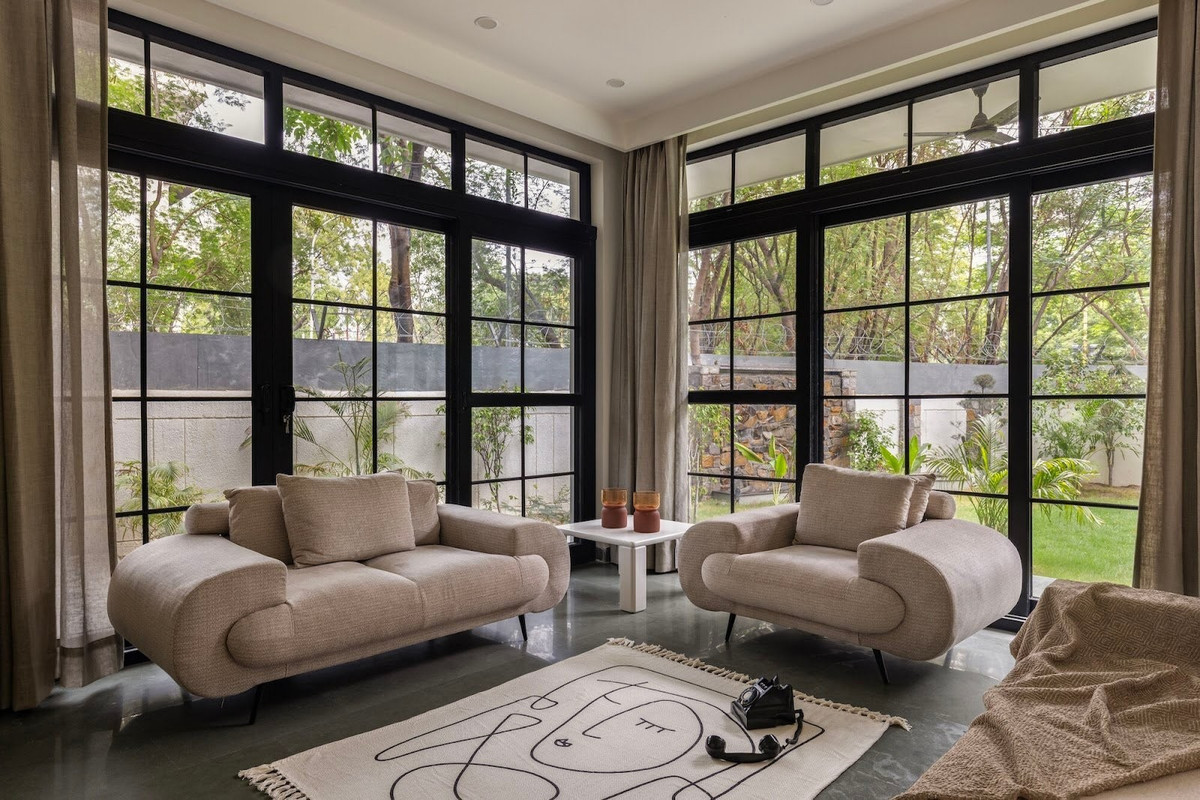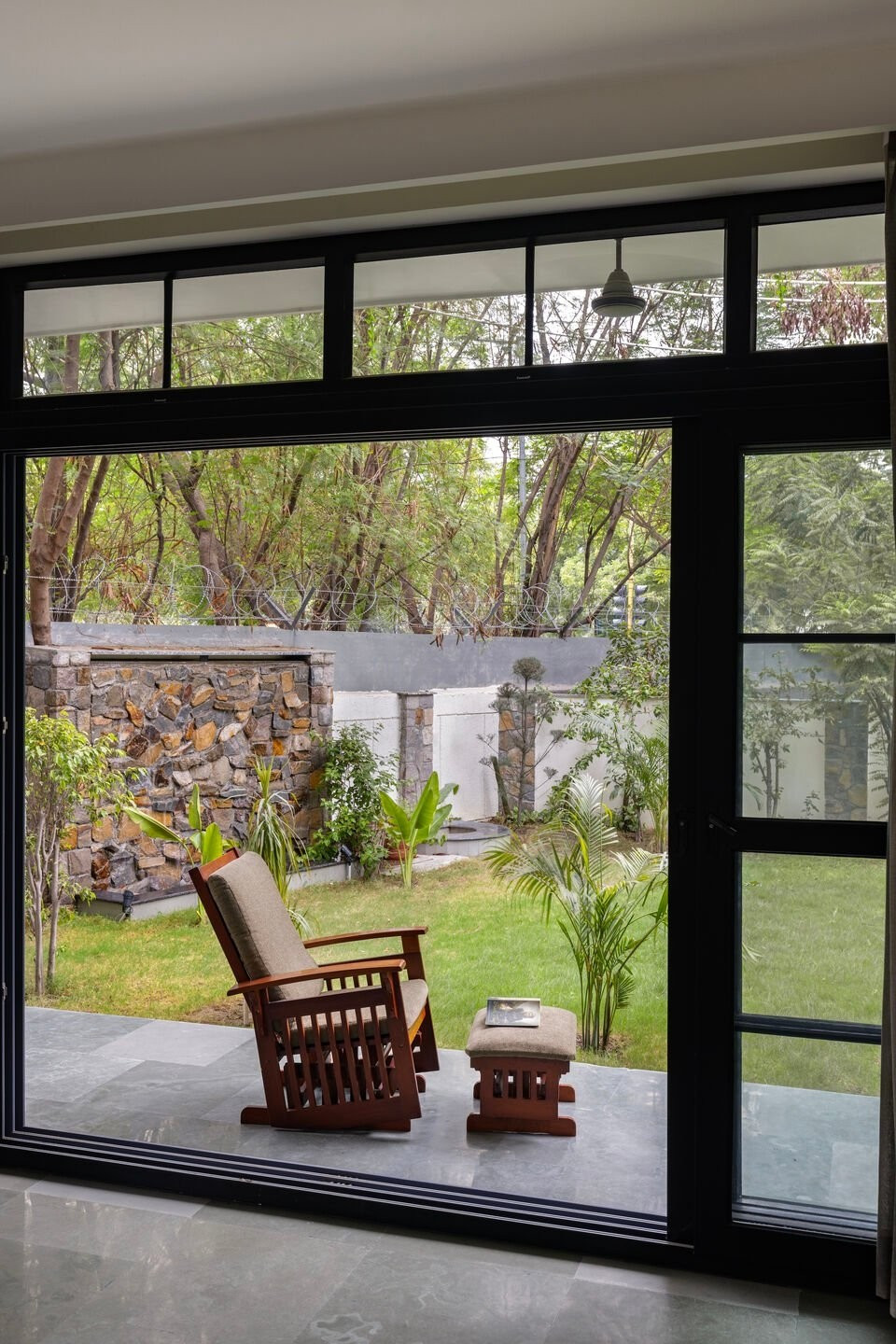 Ngôi nhà gồm 3 tầng, được tổ chức dựa trên trật tự không gian rõ ràng. Tại tầng trệt, lối vào chính mở ra một tiền sảnh có trần cao gấp đôi, tạo cảm giác rộng mở theo chiều dọc. Phòng khách mở ra khu vườn hướng Đông Bắc. Ảnh: Purnesh Dev Nikhanj