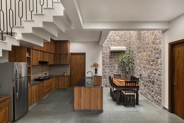 Bếp và khu vực ăn uống được bố trí dọc theo trung tâm, trở thành trái tim trong các hoạt động sinh hoạt của ngôi nhà. Ảnh: Purnesh Dev Nikhanj