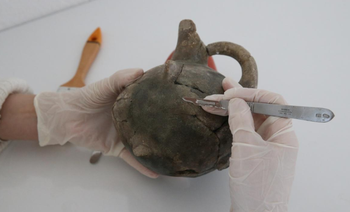 Tại tàn tích ngôi nhà cháy này, các chuyên gia tìm thấy các đồ vật gia dụng như đồ gốm, tượng nhỏ, dụng cụ bằng xương và đồng, các bình chứa, và cả hạt nho đã bị than hóa. Ảnh: @Đại học İzmir.