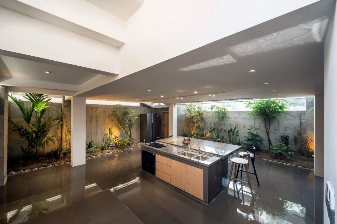 Bếp được bố trí tại khu vực tầng hầm. Nơi đây có cây xanh giúp không gian thêm phần sức sống. Ảnh: Sohu