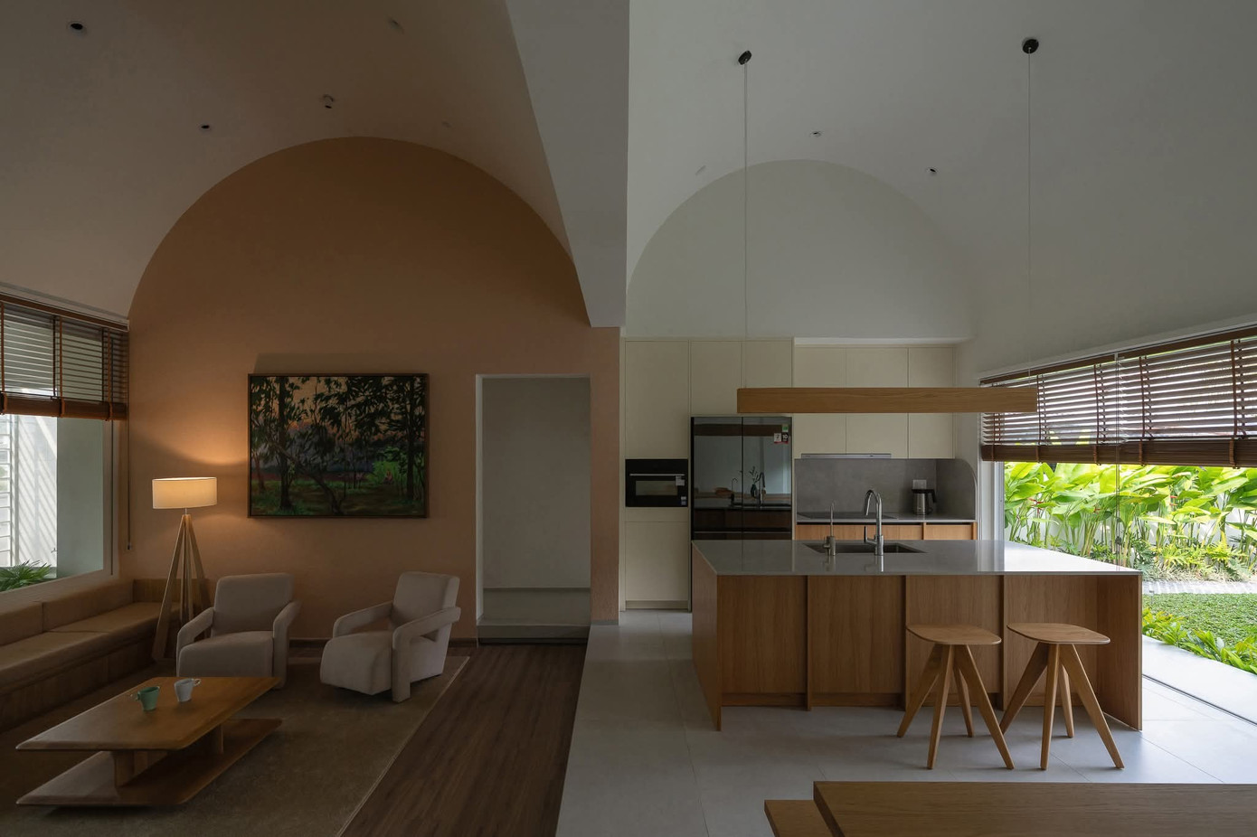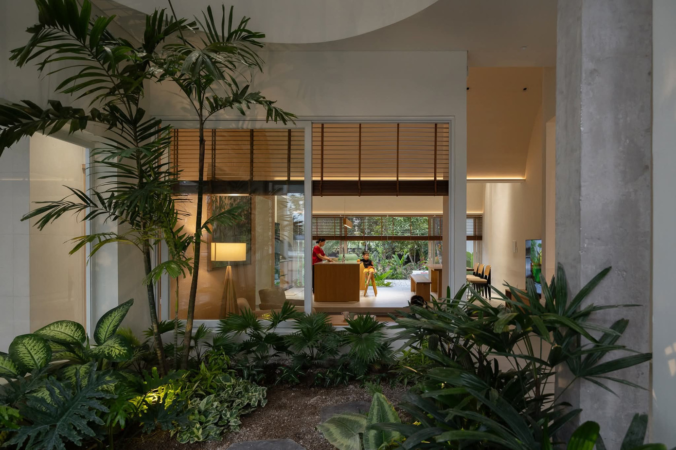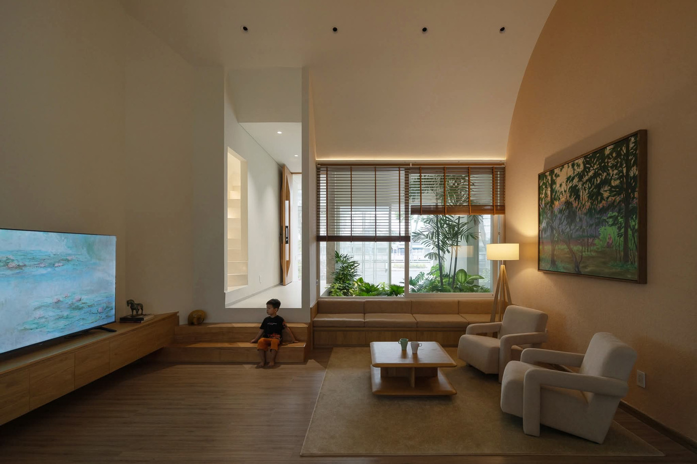 Không gian chung được kết nối với mảng xanh theo trục dọc và trục đứng của ngôi nhà, đảm bảo yếu tố thông gió, chiếu sáng tự nhiên, và tăng tính trải nghiệm cho các thành viên trong gia đình.