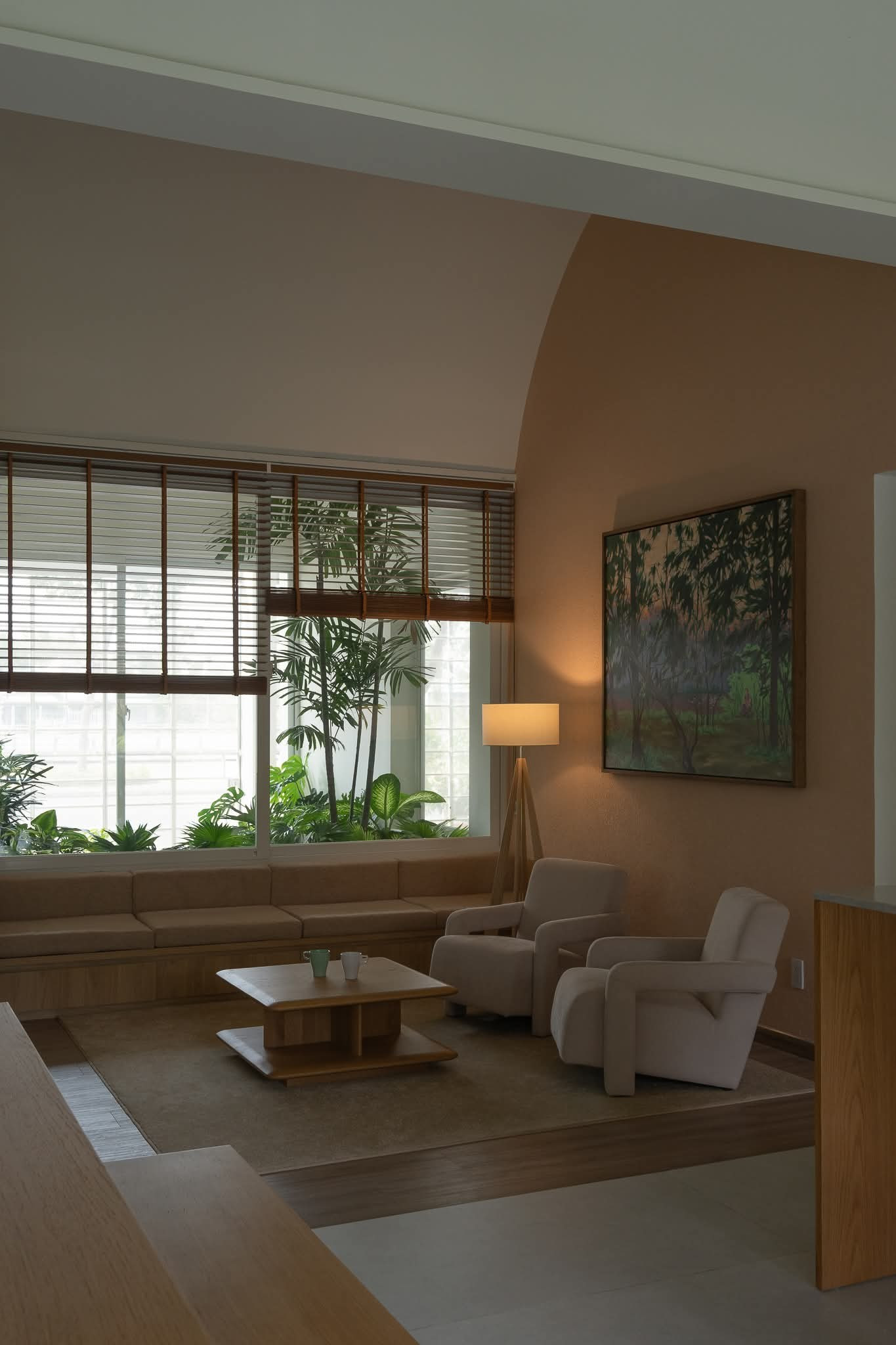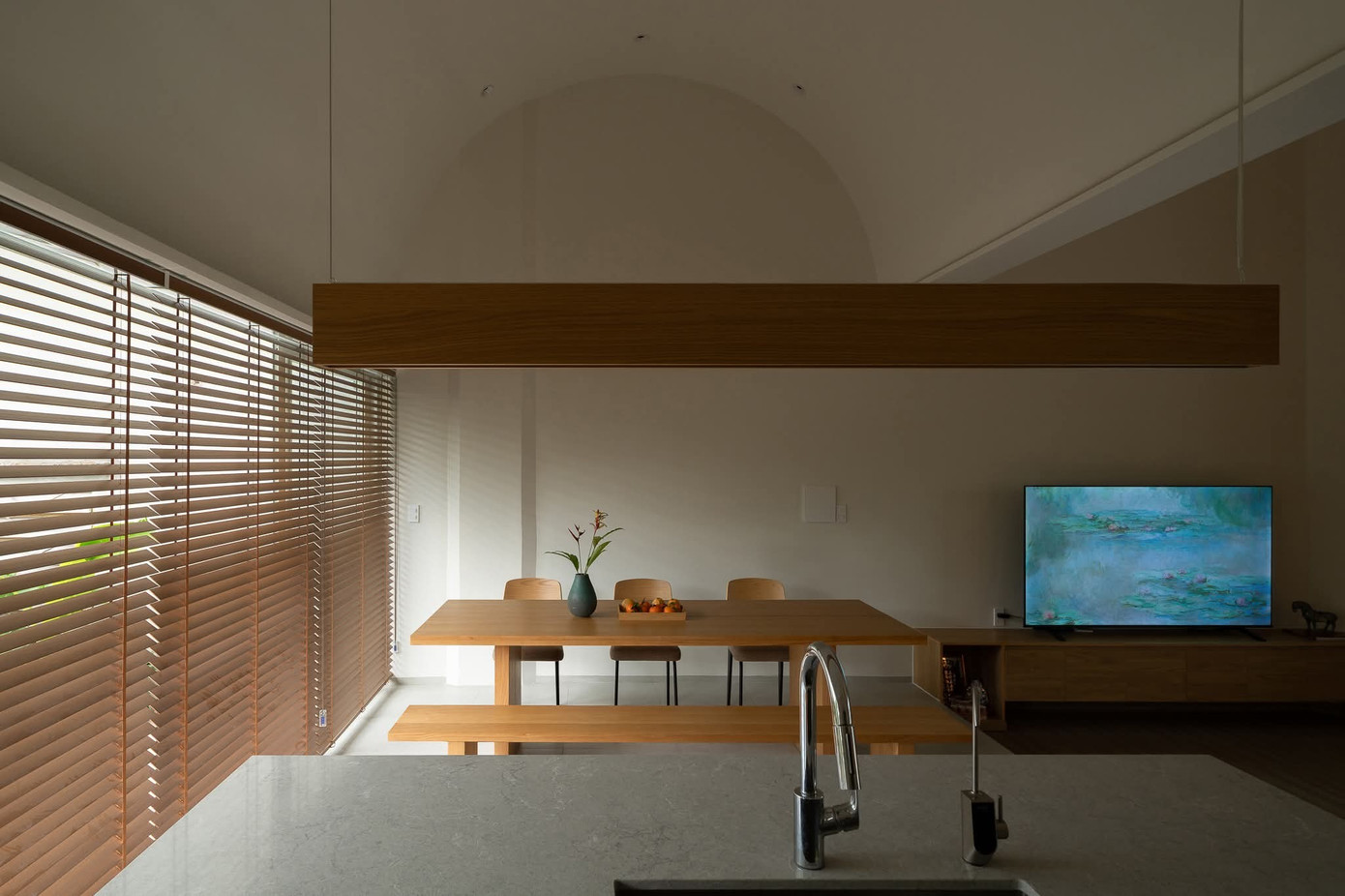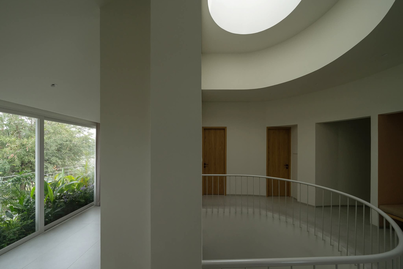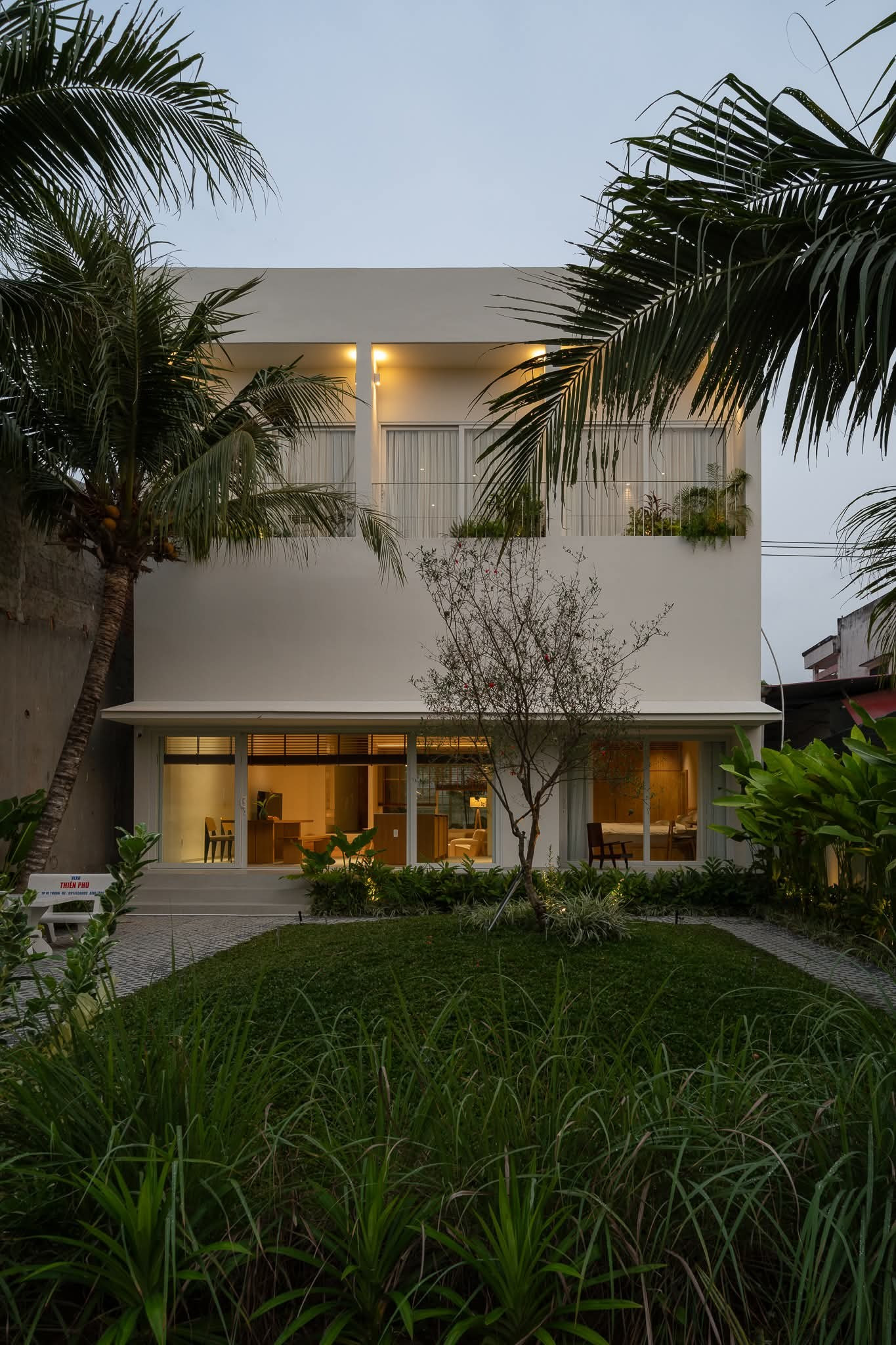 Không gian chung được kết nối với mảng xanh theo trục dọc và trục đứng của ngôi nhà, đảm bảo yếu tố thông gió, chiếu sáng tự nhiên, và tăng tính trải nghiệm cho các thành viên trong gia đình.
