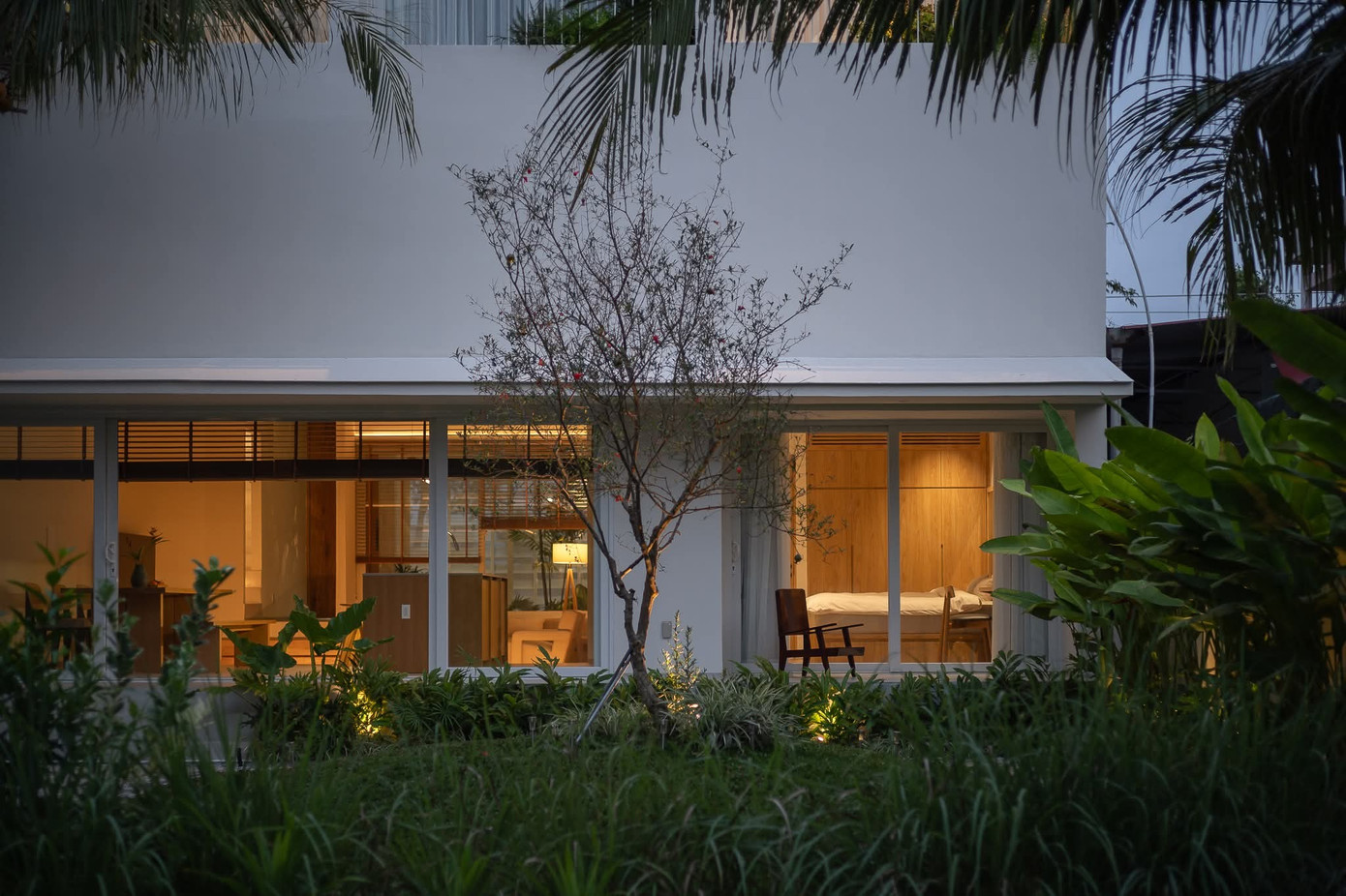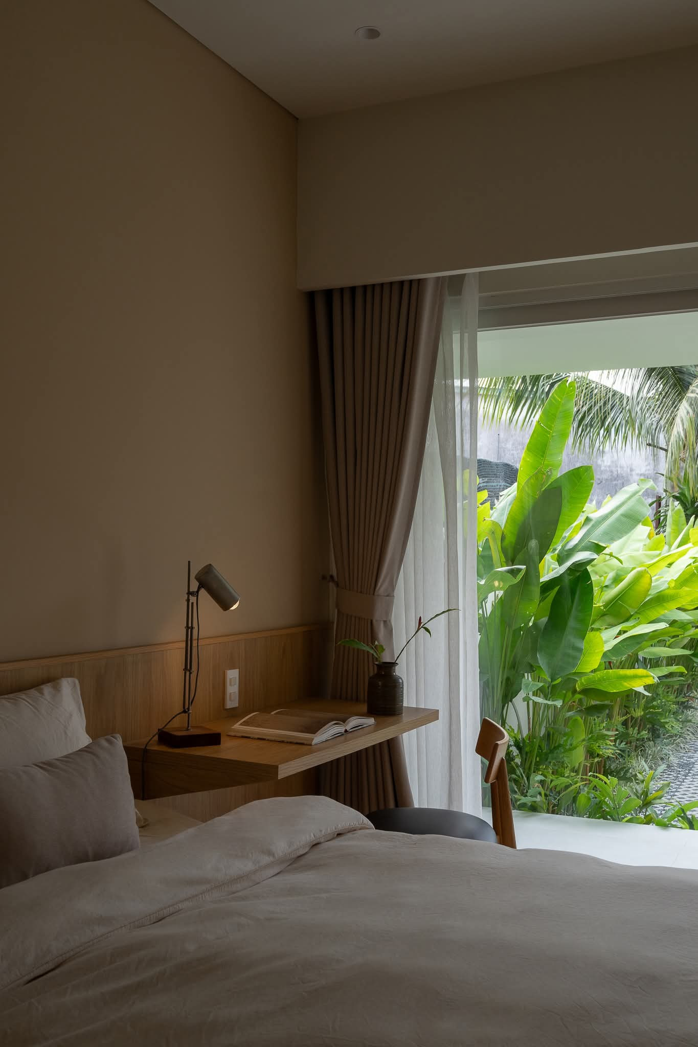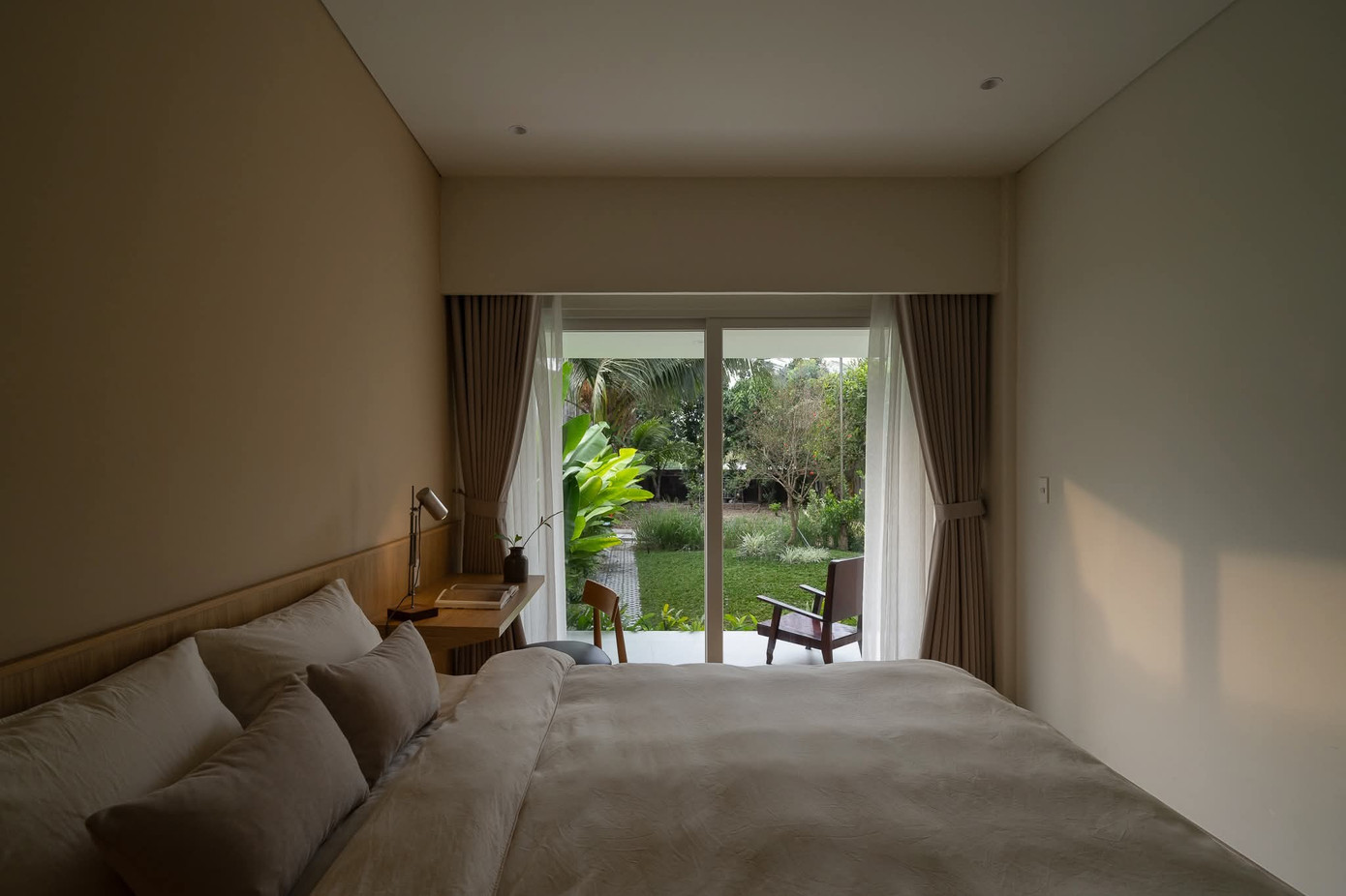 Các phòng ngủ đều được bố trí mảng vườn riêng, với cửa kính lớn linh hoạt đóng mở, kết nối với view ra kênh Xà No và khu vườn cây ăn trái phía sau của căn nhà.