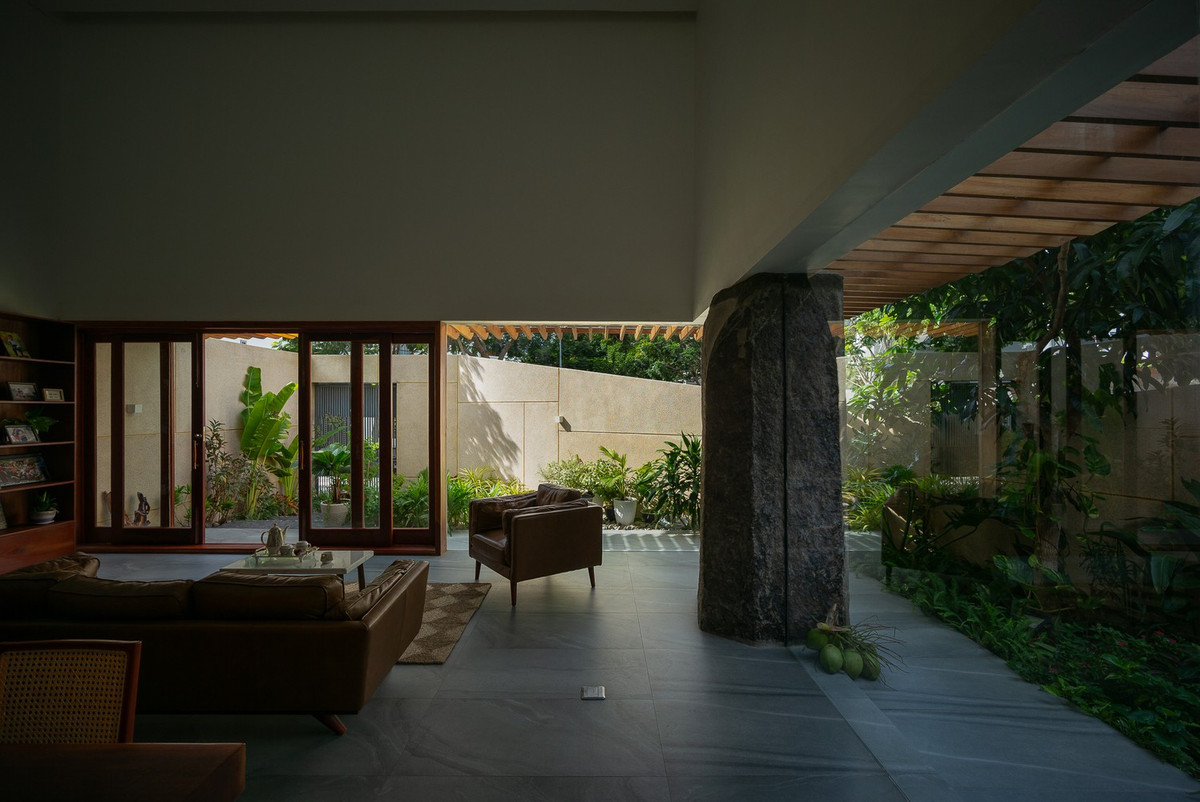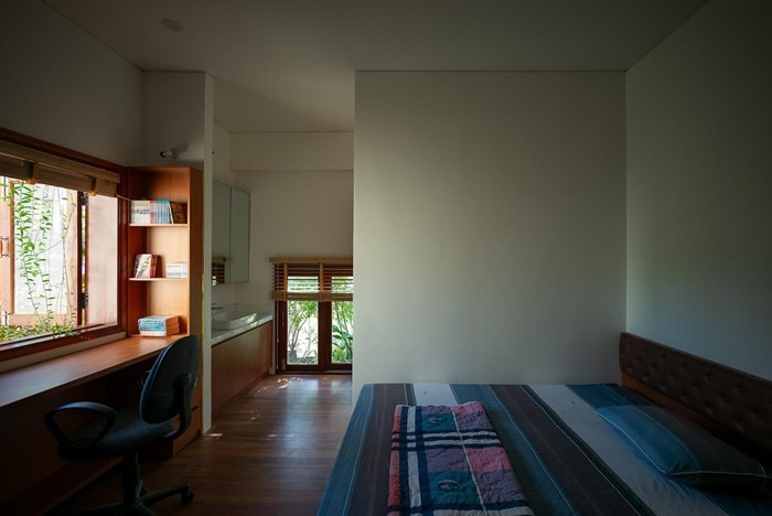 Các không gian riêng tư được nén chặt một cách có chủ đích. Do đó, ngôi nhà có các khoảng trống để kết nối, tạo ra vùng đệm nhiệt và lưu thông không khí mát mẻ. Ảnh: Quangdam