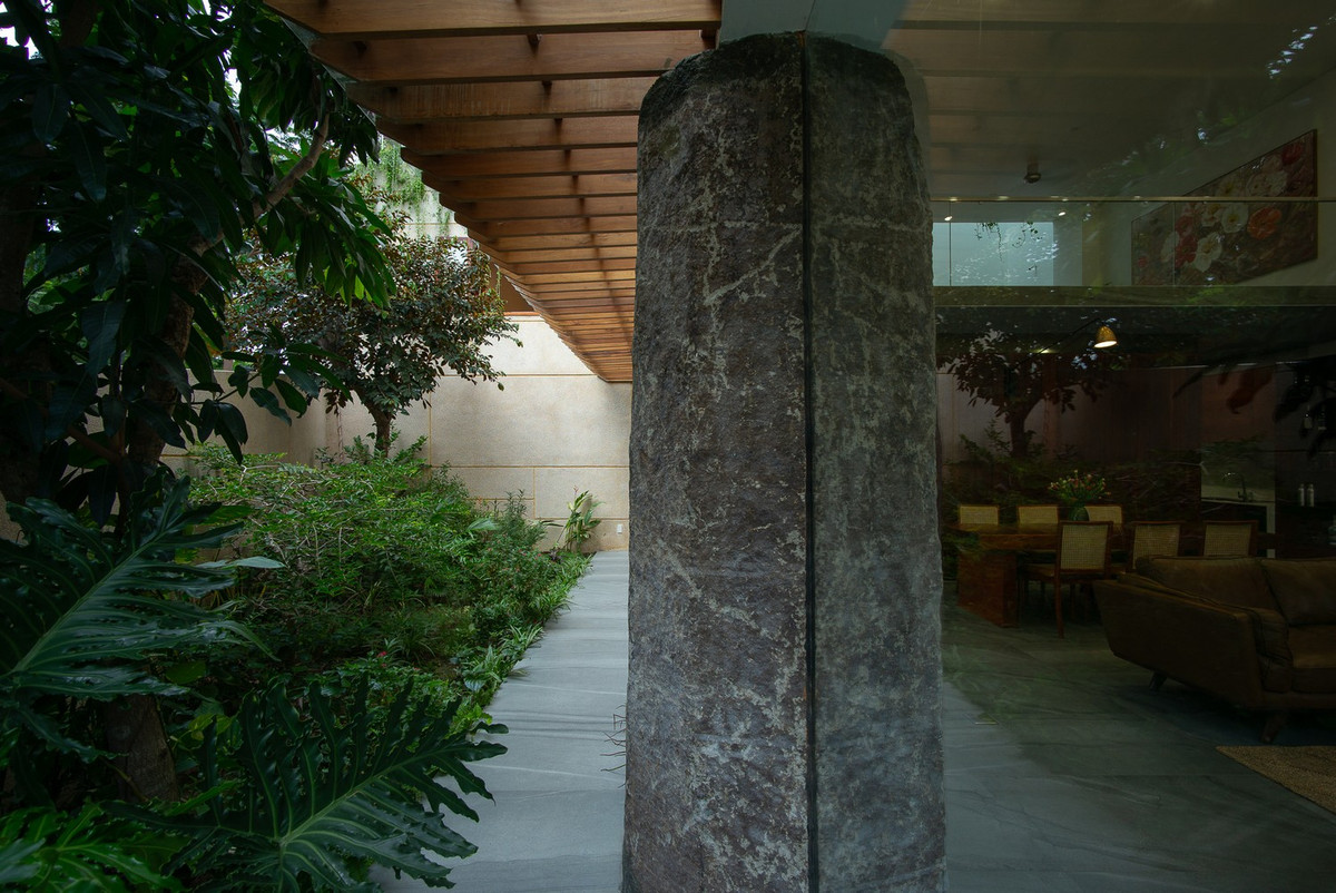 Để giảm bớt sức nóng gay gắt từ hướng Đông và Tây, ngôi nhà được thiết kế như một phiến đá được nâng lên, tạo ra một không gian đệm bên dưới, giống như một mái vòm. Ảnh: Quangdam