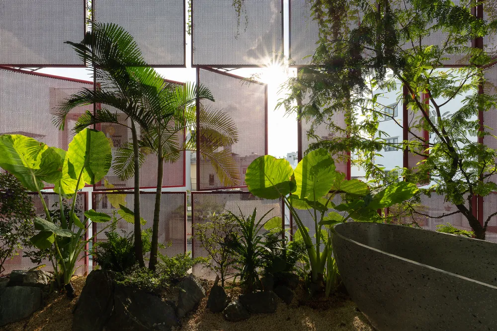 Mặt tiền hai lớp là điểm nhấn nổi bật với lớp ngoài bằng khung sắt hoa văn năng động giúp giảm bức xạ mặt trời phía tây.