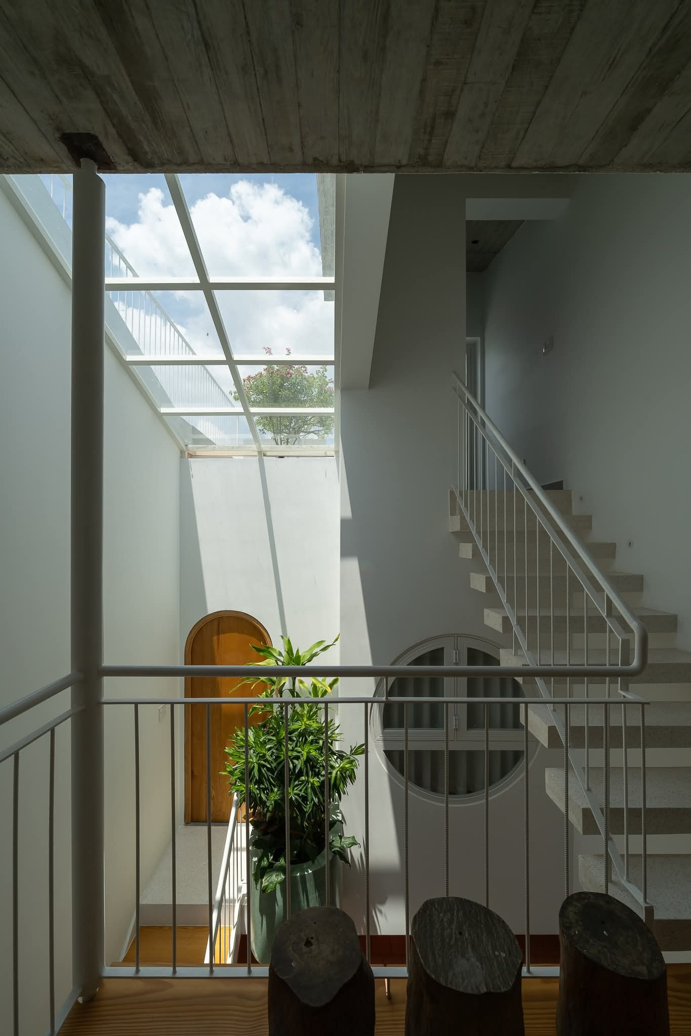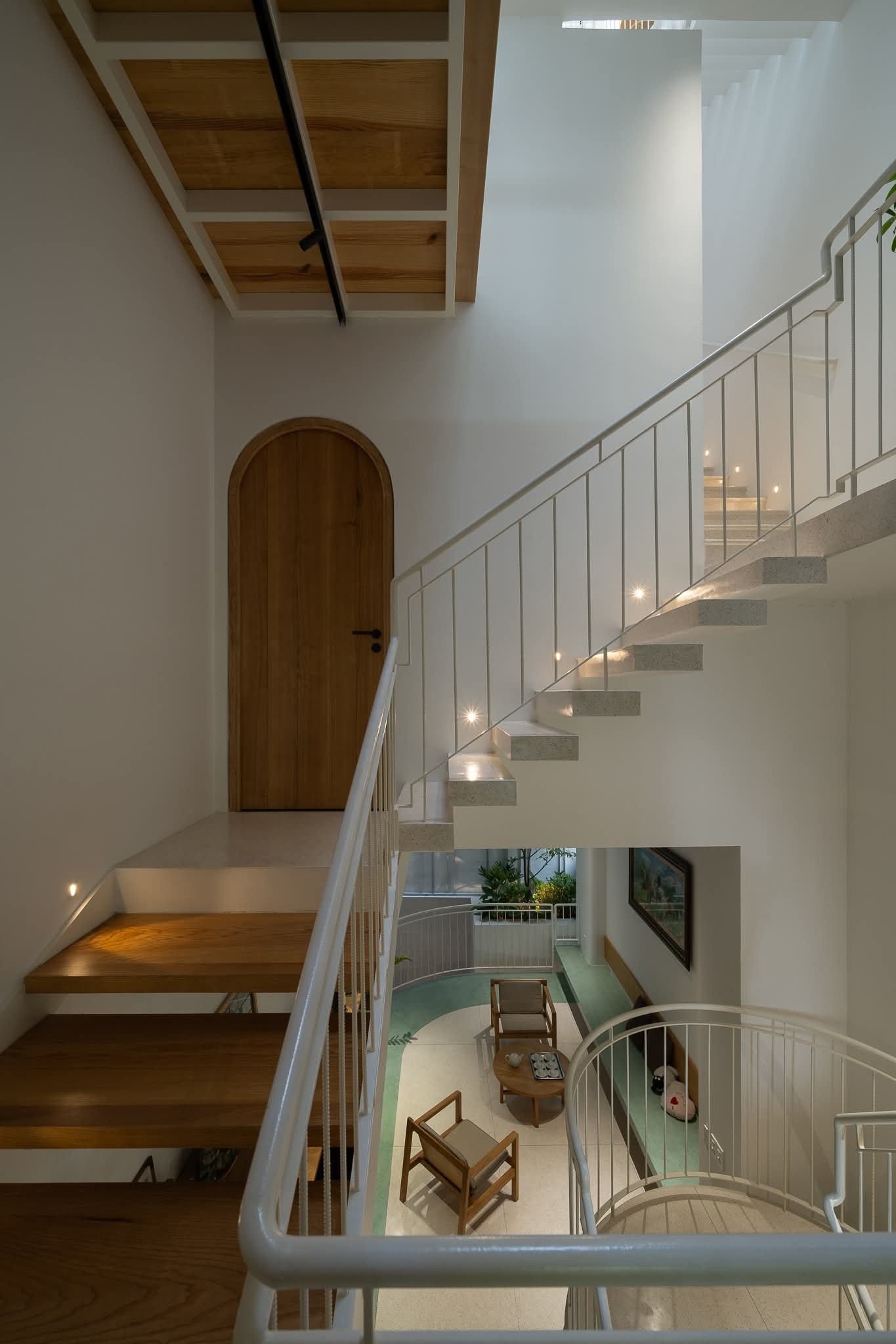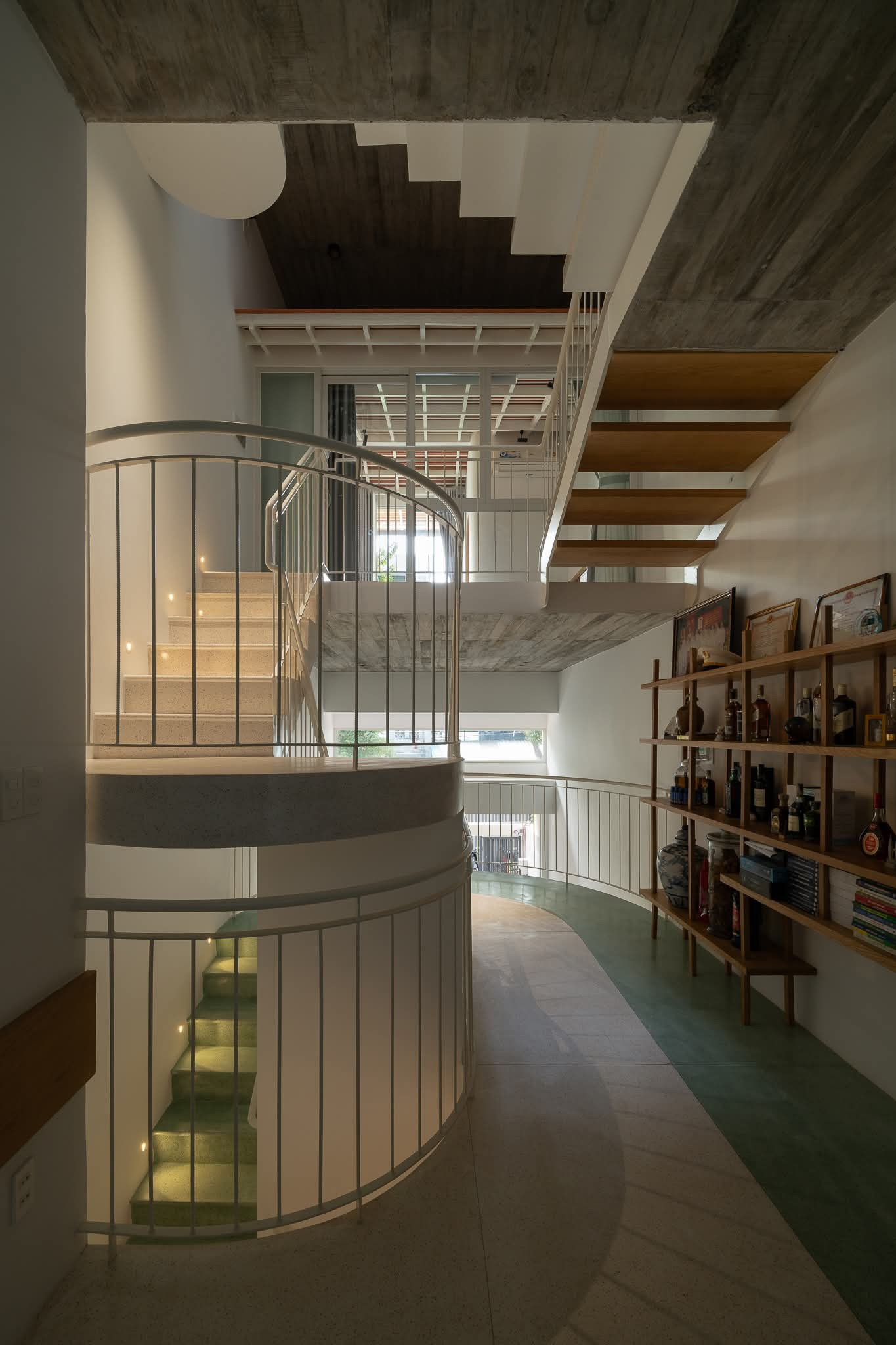 Các khối chức năng được liên kết bằng cầu thang, hình thành trục giao thông tự nhiên, giúp không gian vừa cân bằng vừa linh hoạt.
