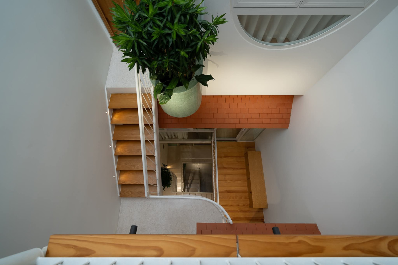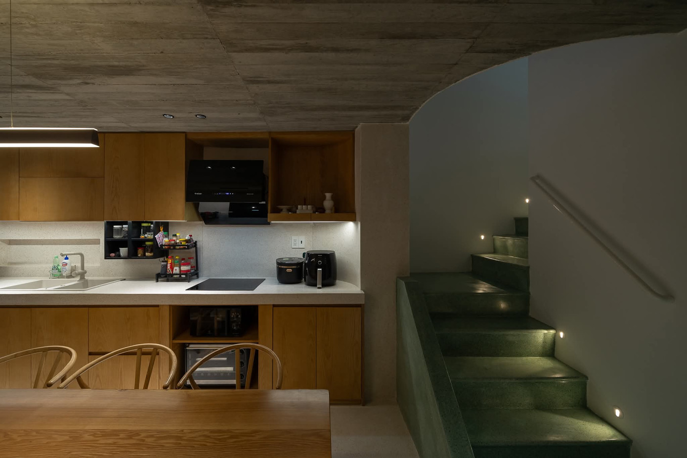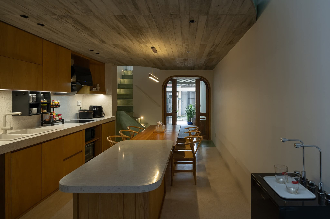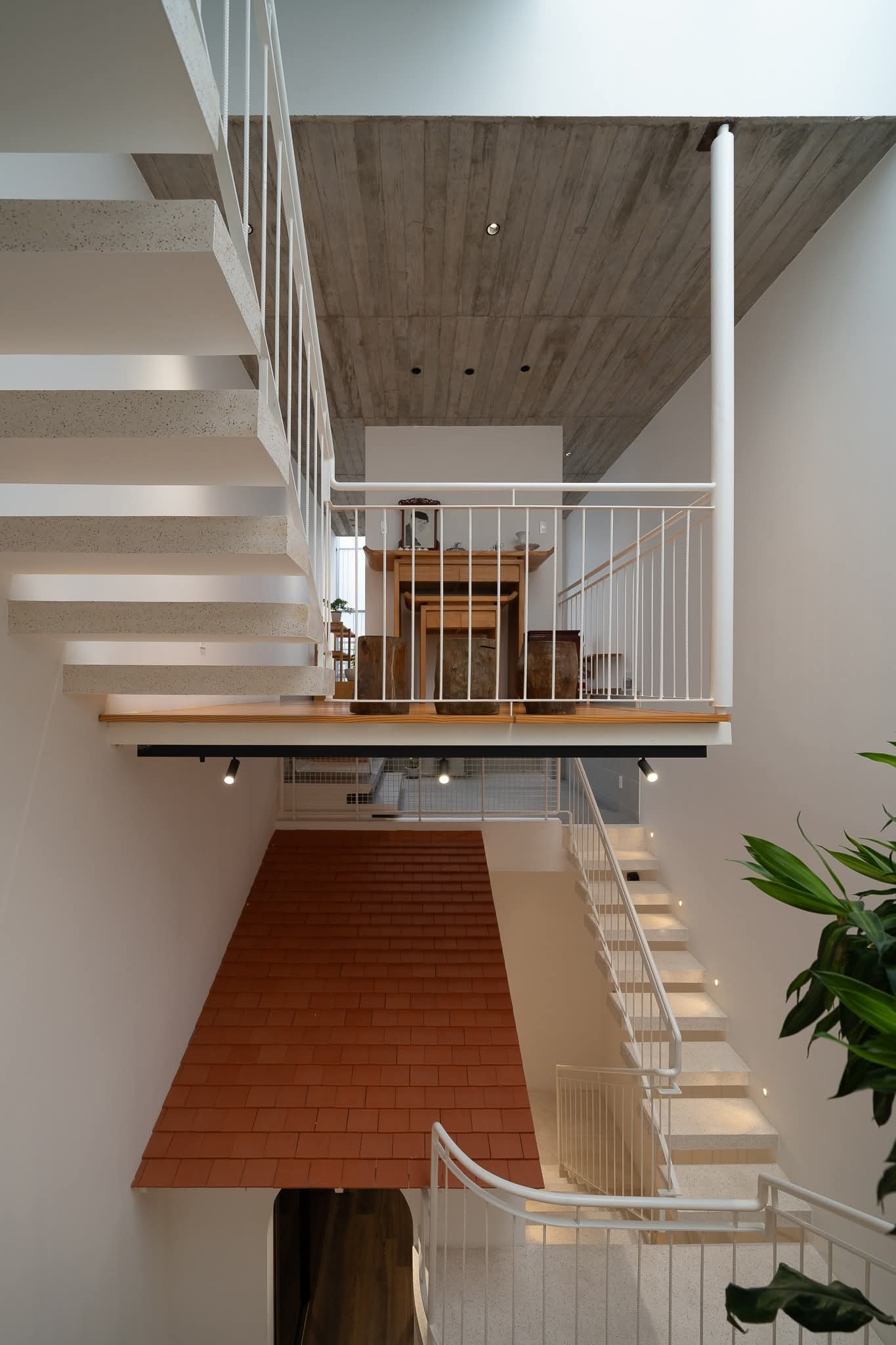 Các khối chức năng được liên kết bằng cầu thang, hình thành trục giao thông tự nhiên, giúp không gian vừa cân bằng vừa linh hoạt.