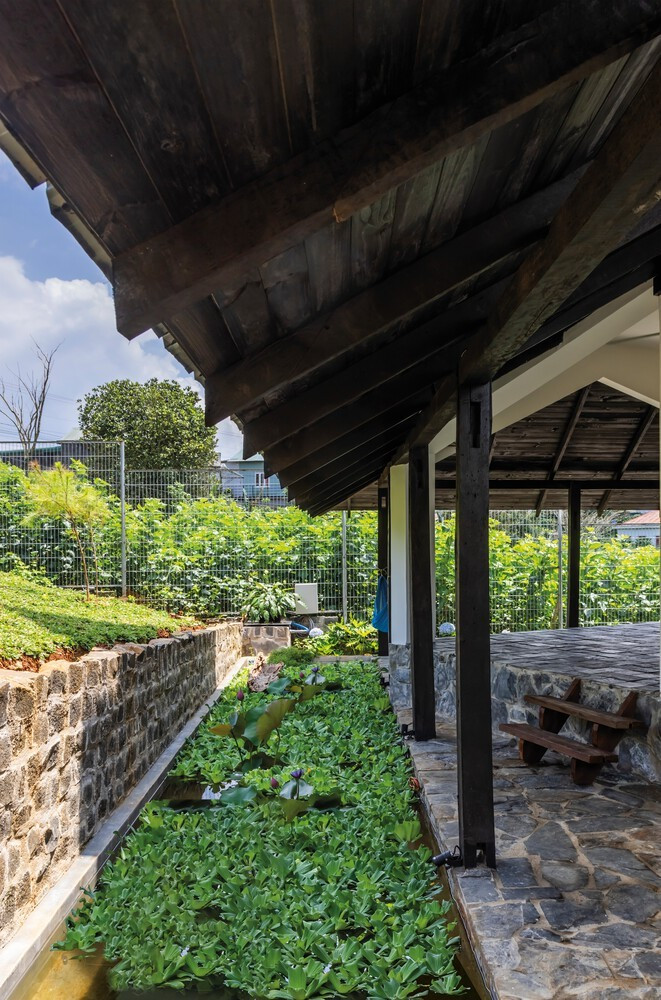 Mái hiên thấp mở rộng không gian sống, đồng thời đóng vai trò như một tấm khiên nhẹ nhàng, lọc ánh sáng và mưa. Ảnh: Hiroyuki Oki