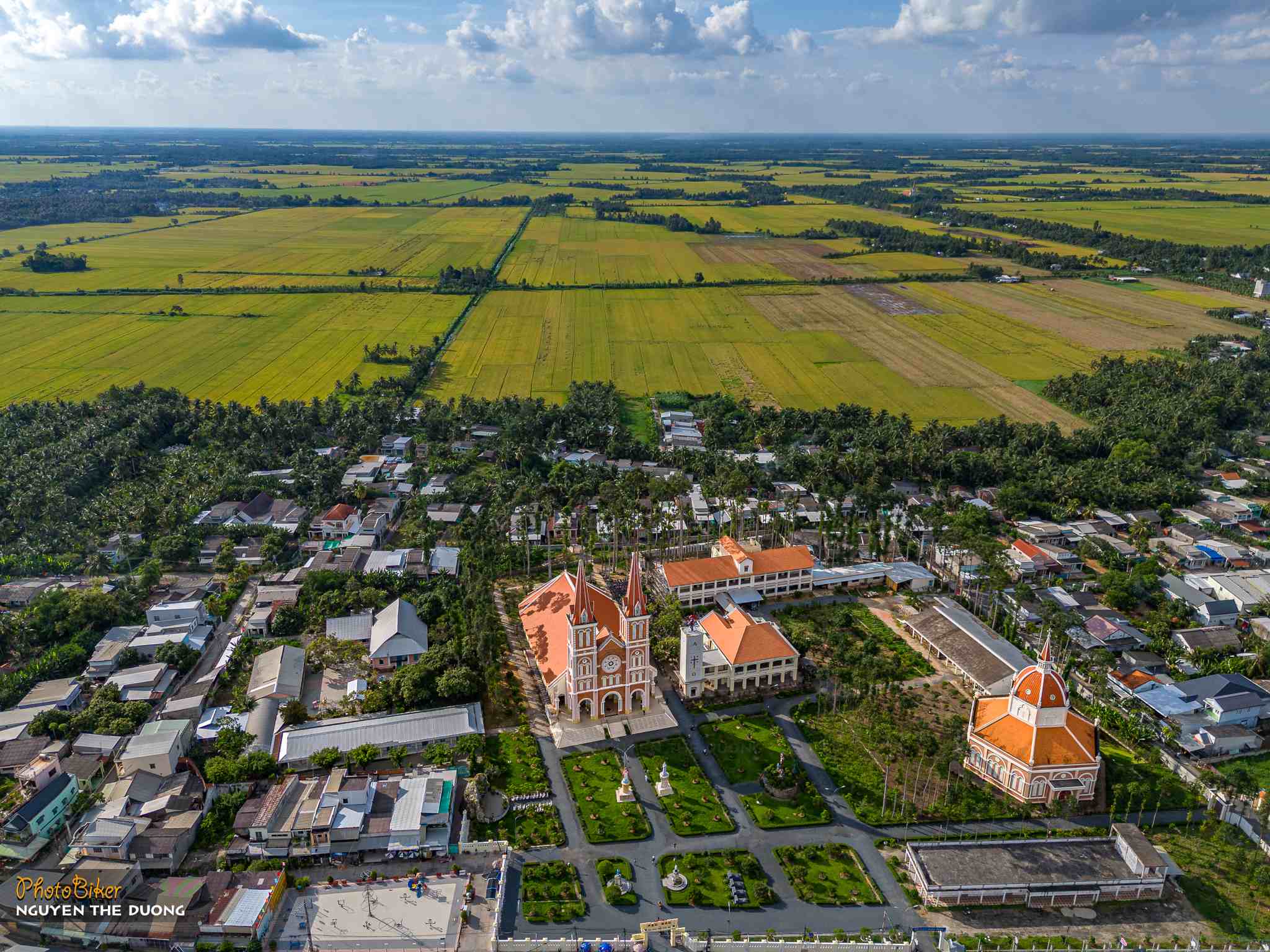 Khuôn viên nhà thờ rộng hơn 1 ha, được che mát bởi những hàng sao cổ thụ, tọa lạc trên giồng đất cao ráo, cổng chính hướng ra ngã ba giao nhau giữa quốc lộ 60 và con đường dẫn tới chợ cùng bến tàu Cầu Quan sầm uất. Ảnh: Nguyễn Thế Dương