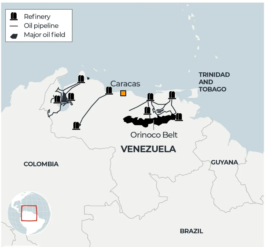 Bản đồ cho thấy các mỏ dầu trữ lượng lớn nhưng khó khai thác của Venezuela tập trung ở vành đai Orinoco, cùng hệ thống đường ống và nhà máy lọc dầu. Ảnh: Aljazeera