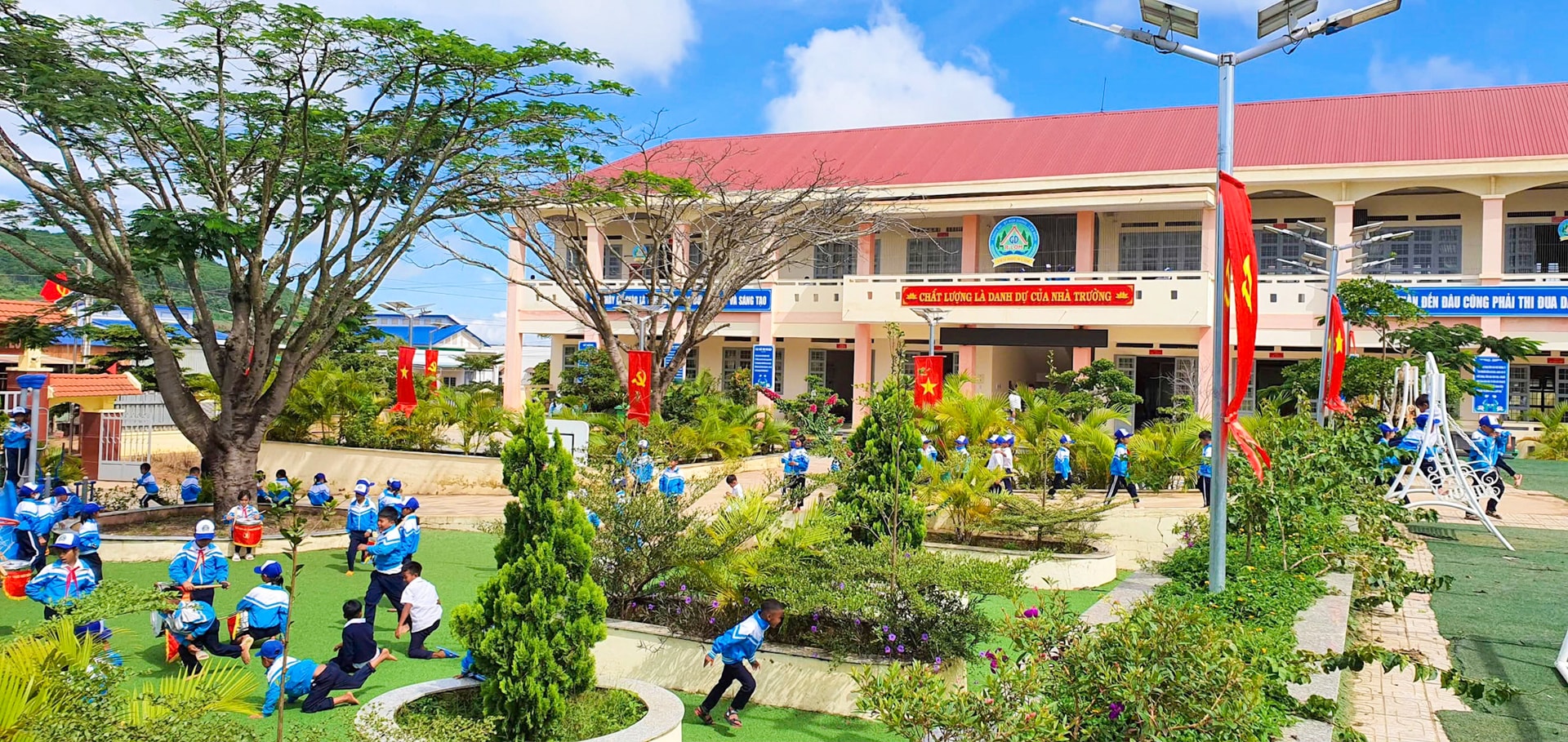 Không gian học tập xanh - sạch - đẹp giúp Trường Tiểu học R’Lơm duy trì tỷ lệ học sinh đến lớp cao hằng năm