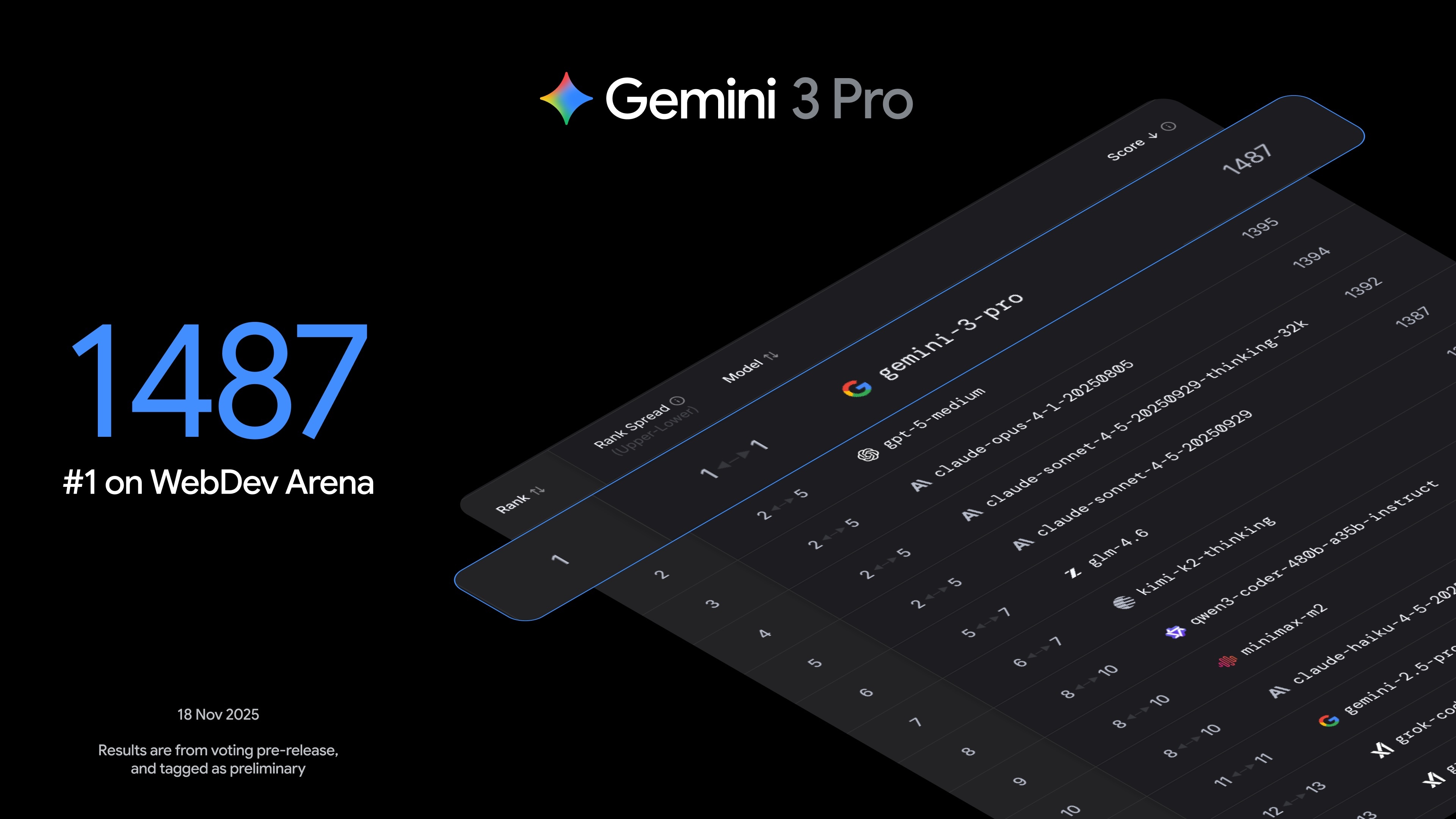 Điểm số của Gemini 3 Pro trên thang đo WebDev Arena do Google thực hiện. Ảnh: Google.