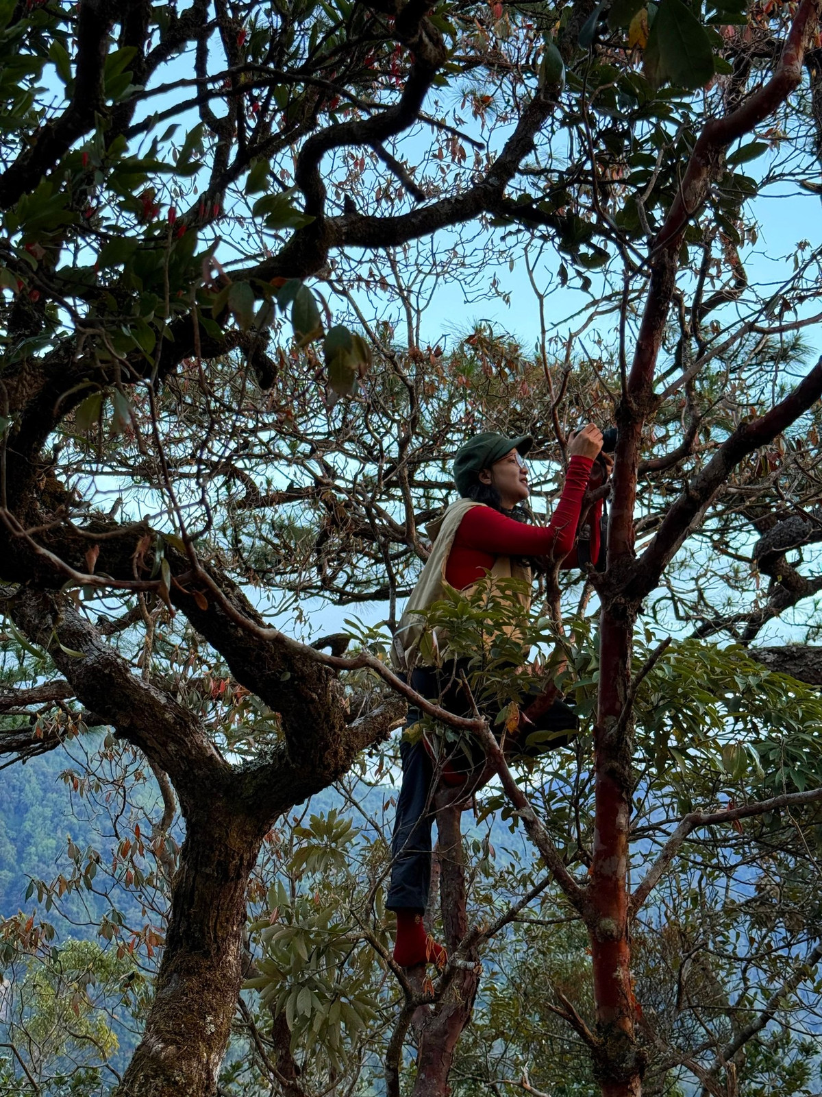 Rời rừng rêu, cung đường tiếp tục mở ra giữa rừng trúc xanh mướt. Ánh nắng len lỏi qua từng kẽ lá, hắt xuống mặt đất những vệt sáng lung linh. Đây là đoạn đường mang đến cảm giác nhẹ nhàng hơn, đủ để người leo núi nghỉ chân, hít căng lồng ngực bầu không khí trong lành và lưu lại những khung hình ấn tượng giữa thiên nhiên hoang sơ. Ảnh NP Lê Na