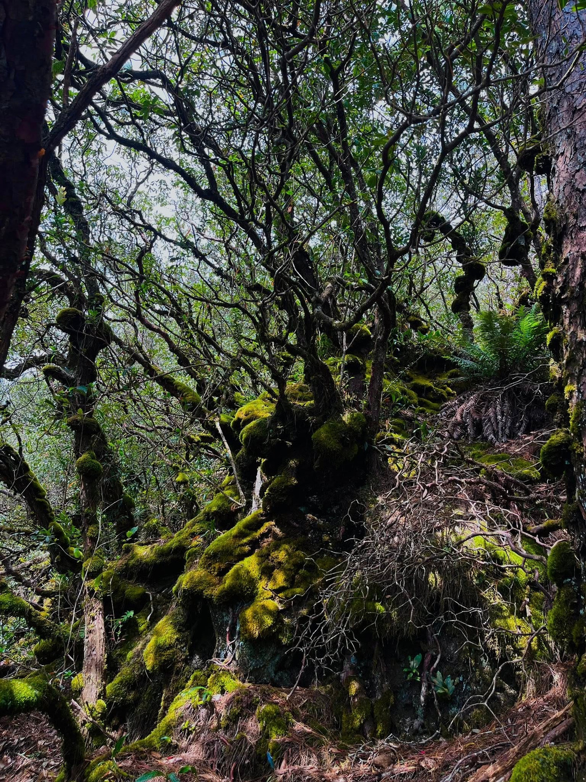 Giữa không gian tĩnh lặng, những thân cây cổ thụ phủ dày lớp rêu xanh mướt, từng tảng đá ẩm mềm trong làn sương mỏng tạo nên khung cảnh huyền ảo như bước ra từ cổ tích. Tiếng chim hót xen lẫn tiếng gió rì rào qua tán lá khiến mọi mệt nhọc dường như tan biến. Ảnh Trung Thích Đi