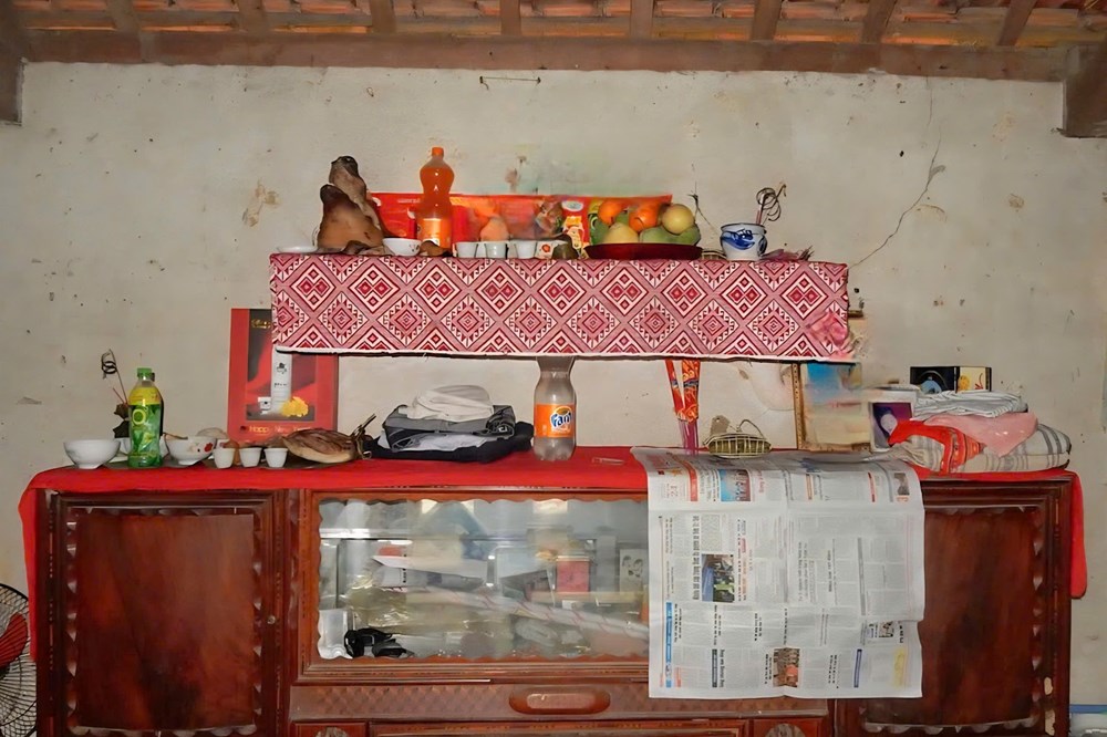 Không gian thờ cúng tổ tiên trong một gia đình đồng bào dân tộc Thái, với mâm lễ giản dị, thể hiện lòng thành kính và nét đẹp tín ngưỡng truyền thống