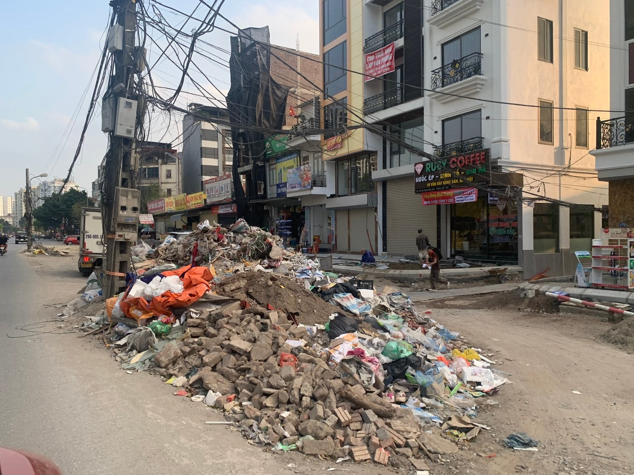 Đáng nói hơn nữa, tình trạng này xuất hiện trên nhiều đoạn của tuyến phố. Có nơi, rác thải sinh hoạt bị vứt ngay sát các công trình đang quây tôn, có nơi rác và đất đá nằm ngay cạnh cột điện, miệng cống thoát nước. Điều này không chỉ gây mất vệ sinh mà còn làm tắc nghẽn hệ thống thoát nước, gia tăng nguy cơ ngập úng khi mưa lớn.