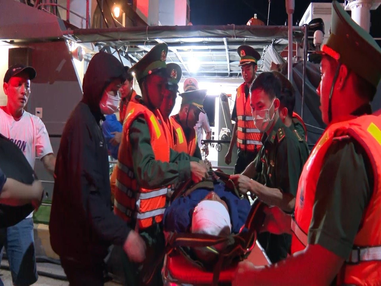 Lực lượng cứu nạn kịp thời tiếp cận tàu cá QNA 91892 TS, tiến hành sơ cứu ban đầu và đưa ngư dân Tính sang tàu SAR 631 để tiếp tục chăm sóc y tế.