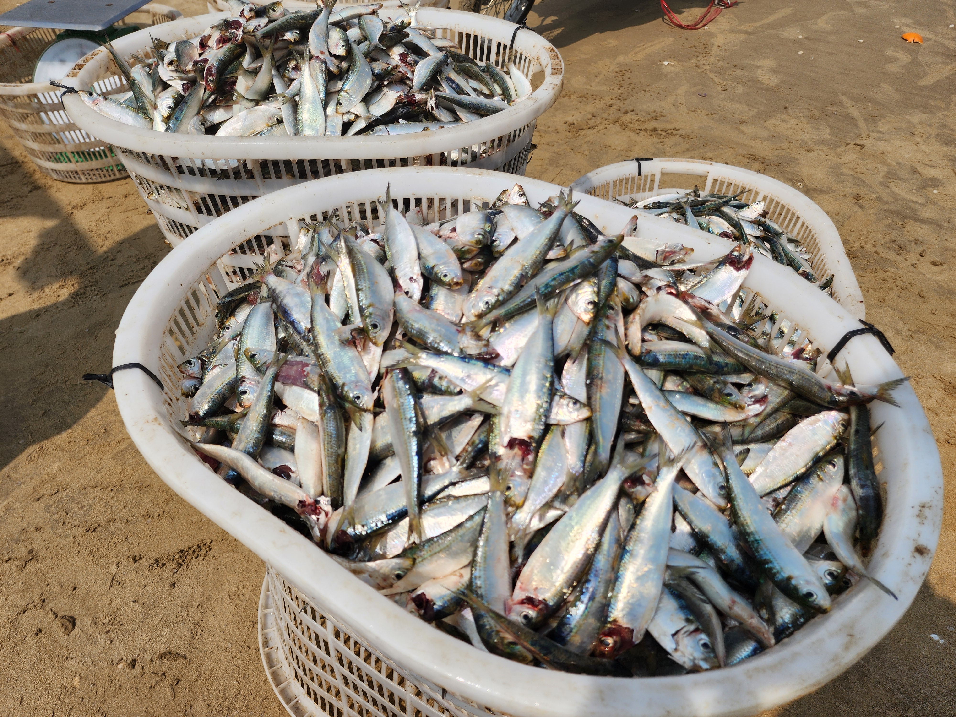 Cá trích dính lưới được ngư dân gỡ tập kết tại bờ biển