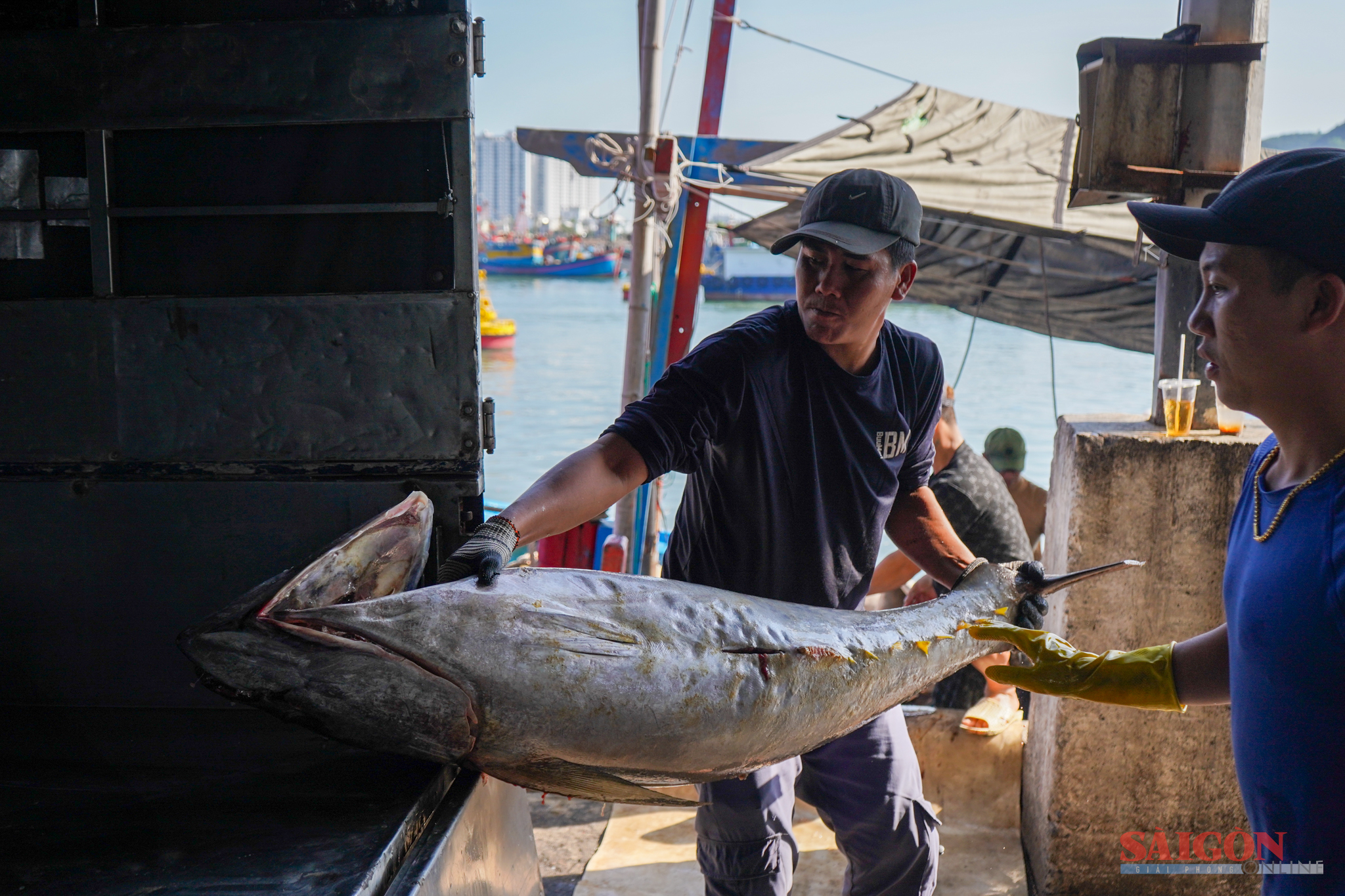 Ngư dân đưa cá ngừ đại dương từ hầm tàu lên cảng bán cho thương lái. Ảnh: HIẾU GIANG