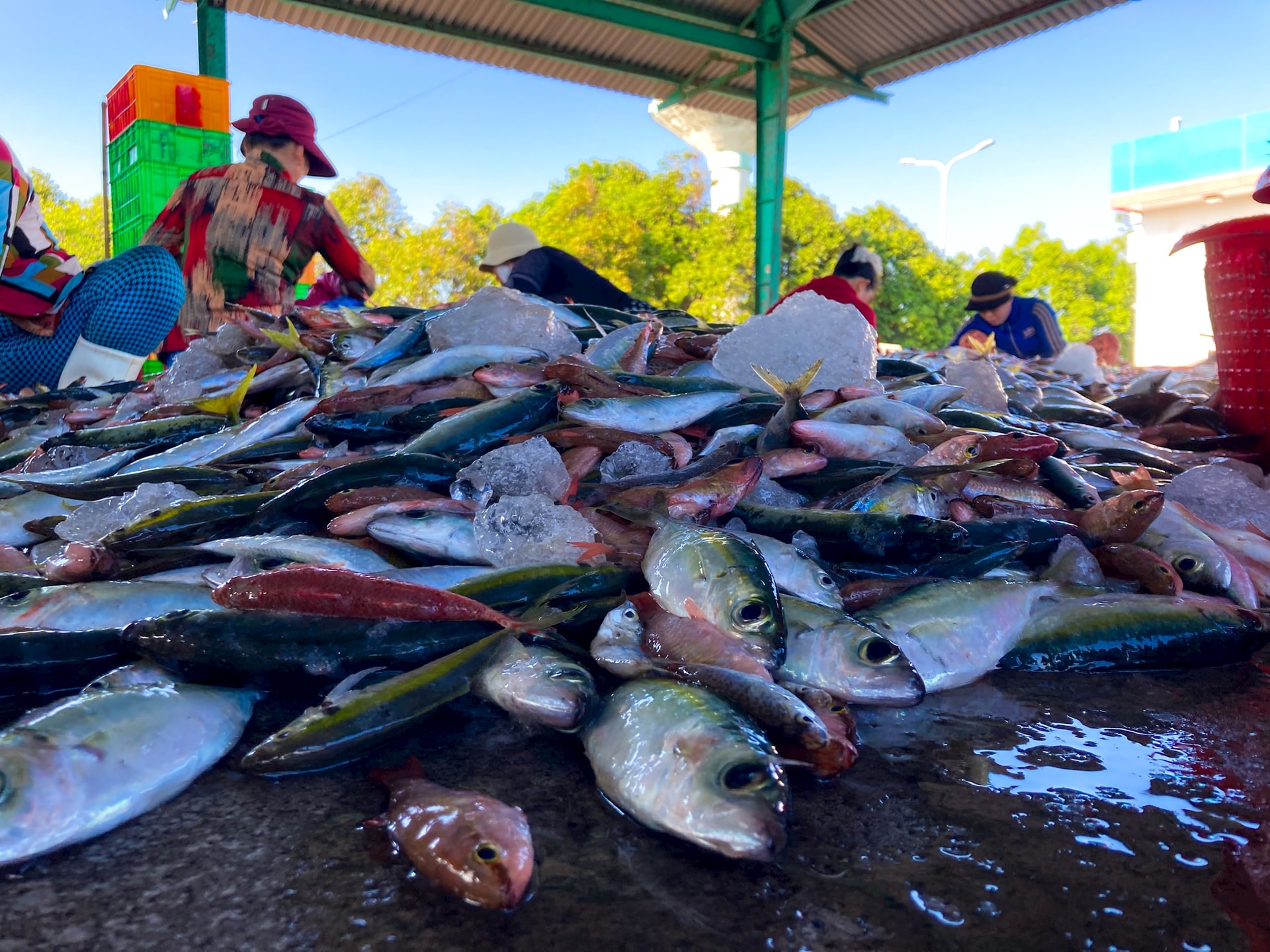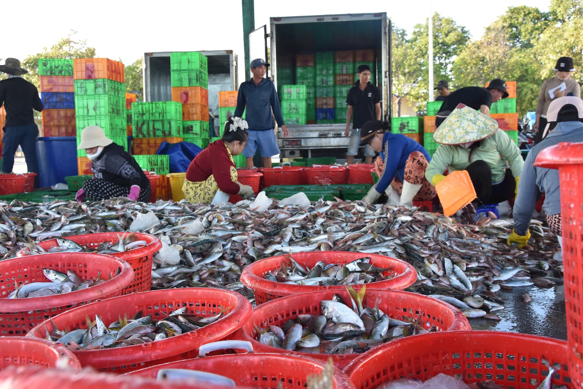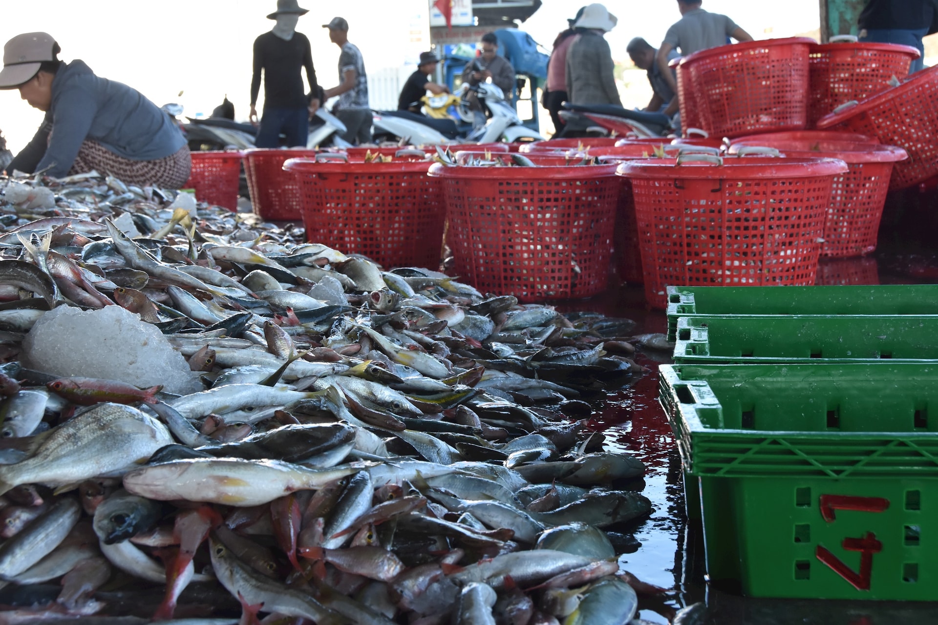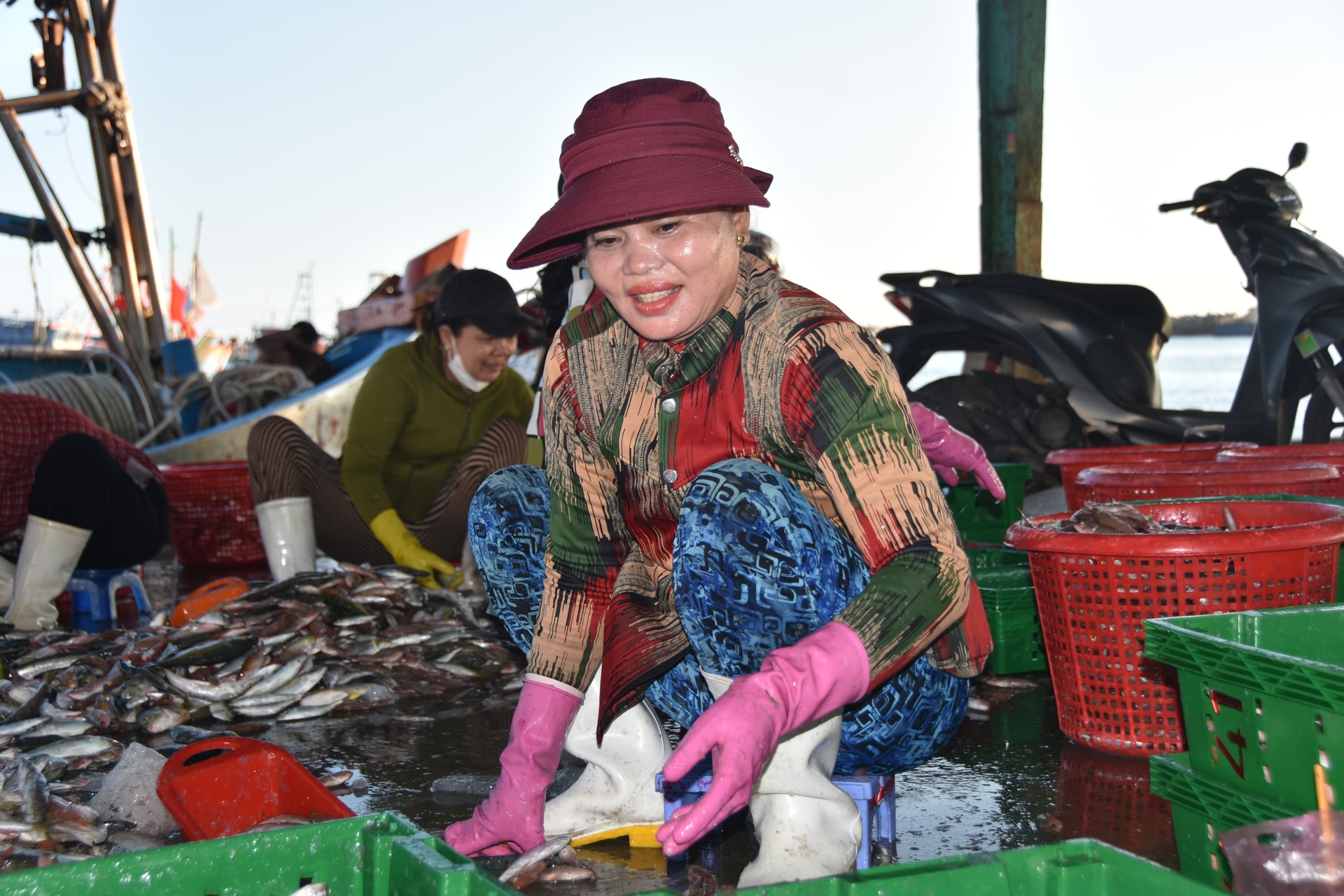 Chị Võ Thị Tám, một tiểu thương thu mua tại cảng cho biết, sản lượng chuyến biển đầu năm nay nhỉnh hơn so với những chuyến trước. Cá tươi, chất lượng tốt nên việc thu mua, tiêu thụ diễn ra nhanh chóng. Bà con kỳ vọng từ nay đến giữa năm, thời tiết và ngư trường tiếp tục thuận lợi để duy trì nguồn thu ổn định. Ảnh: Bảo Giang