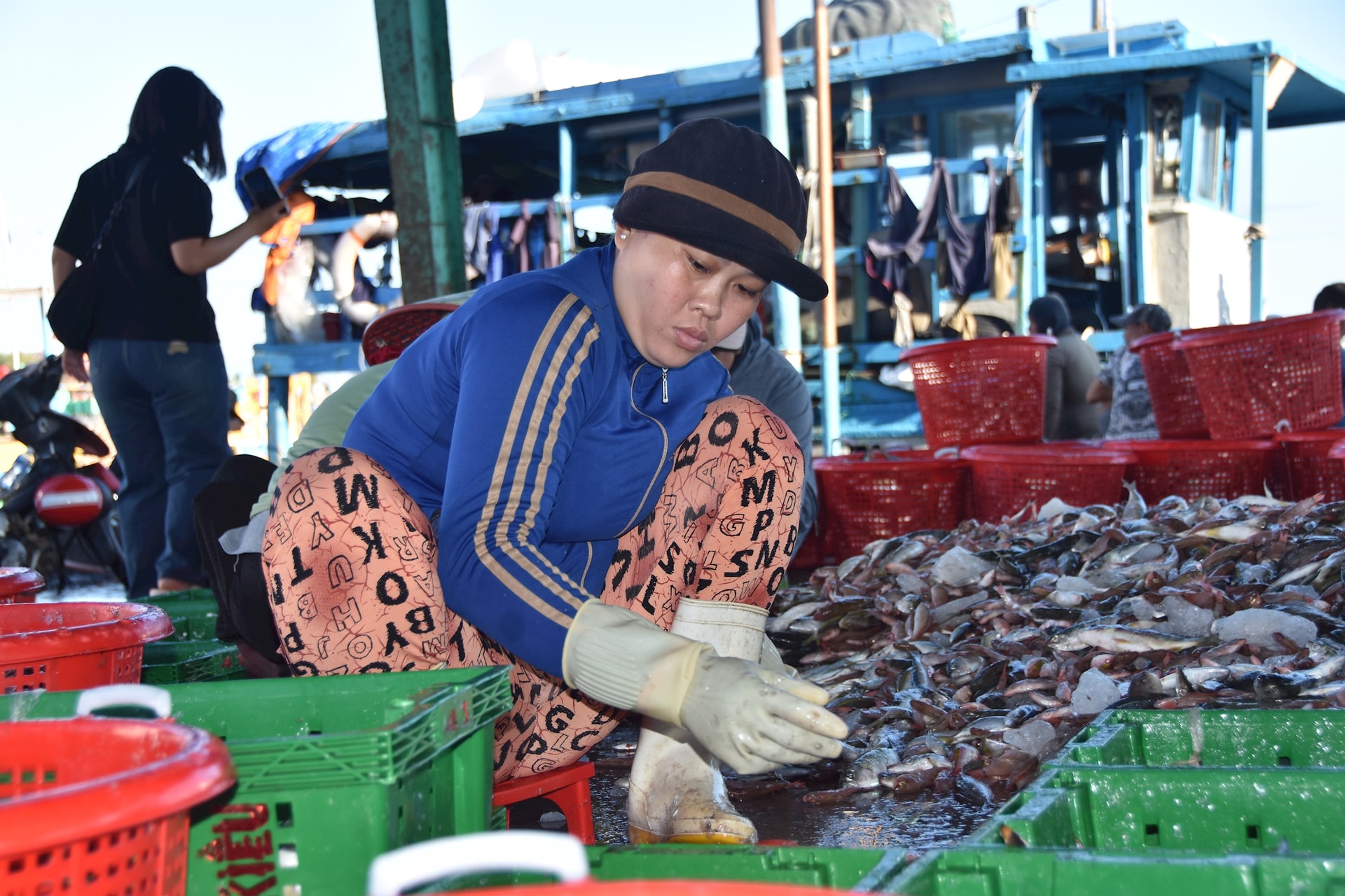 Ngư dân đang phân các loại cá để bán cho tiểu thương ngay sau tàu, ghe cập bến cảng. Ảnh: Bảo Giang