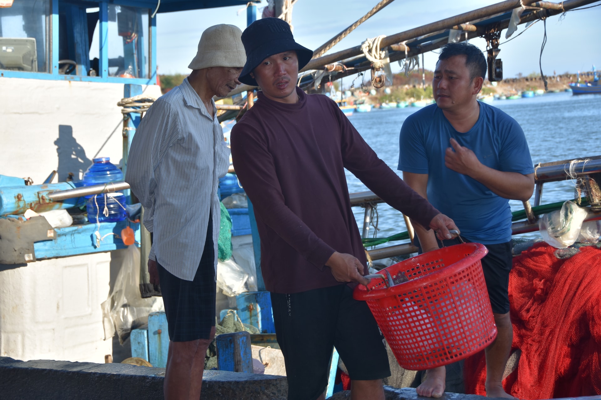 Anh Đăng, chủ tàu BTh-99722-TS, cho biết chuyến biển đầu năm gặp thời tiết thuận lợi, ngư trường xuất hiện nhiều cá nổi và mực nang nên sản lượng đạt khá. Trong đó, mực nang chiếm tỷ lệ đáng kể, góp phần nâng giá trị chuyến biển. “Đầu năm mà trúng cả cá lẫn mực thế này là anh em có thêm động lực bám biển”, anh nói. Ảnh: Bảo Giang
