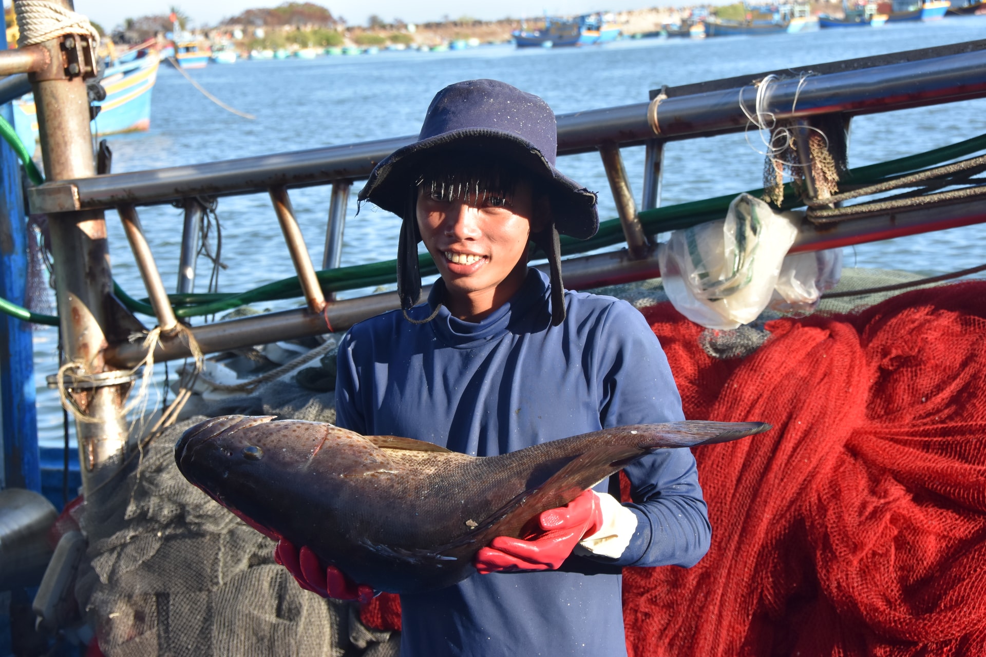 Ngư dân phấn khởi khi đánh bắt được cá mú biển trọng lượng lớn trong chuyến biển đầu năm tại cảng Phú Hài, phường Phú Thủy, tỉnh Lâm Đồng. Ảnh: Bảo Giang