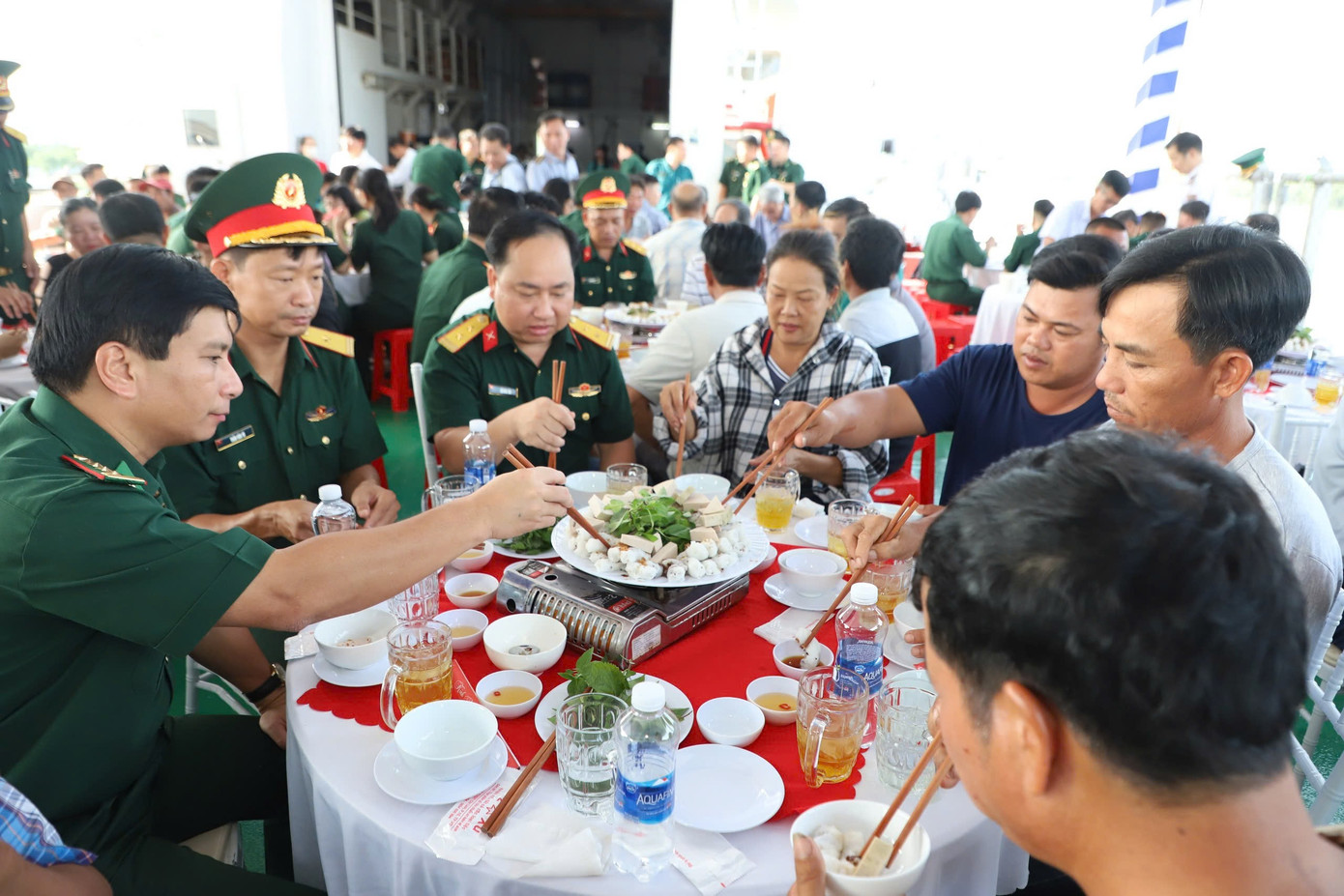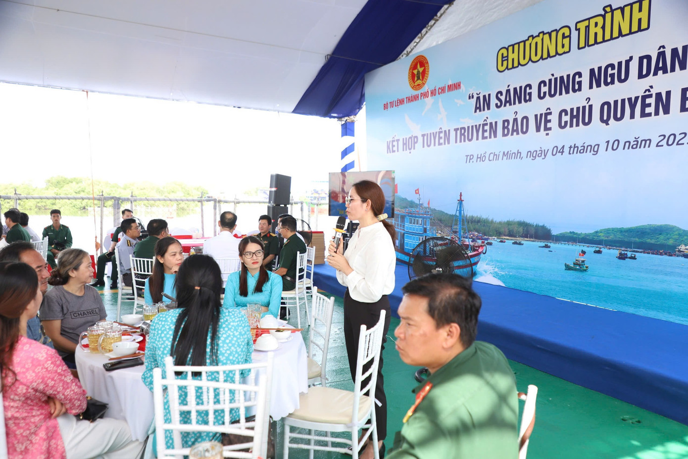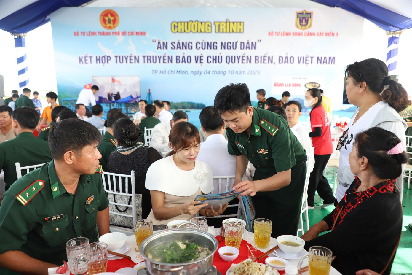 Lãnh đạo các cơ quan chức năng TPHCM dùng bữa sáng cùng ngư dân. Ảnh: Ngô Tùng