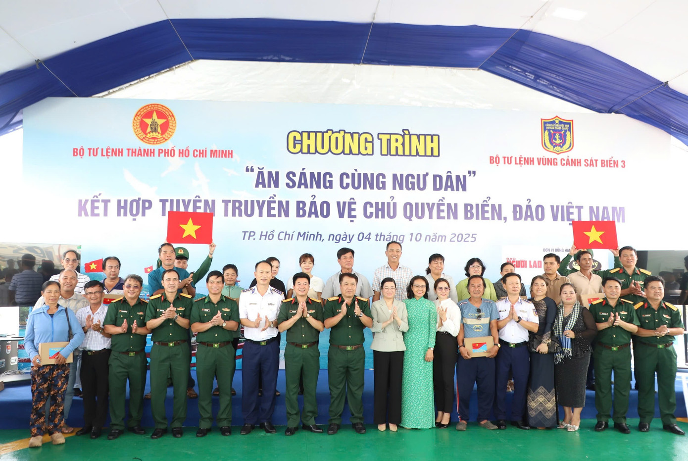 Lãnh đạo TPHCM, Bộ Tư lệnh TPHCM, Bộ Tư lệnh Vùng Cảnh sát biển 3 trao cờ Tổ quốc cho ngư dân.