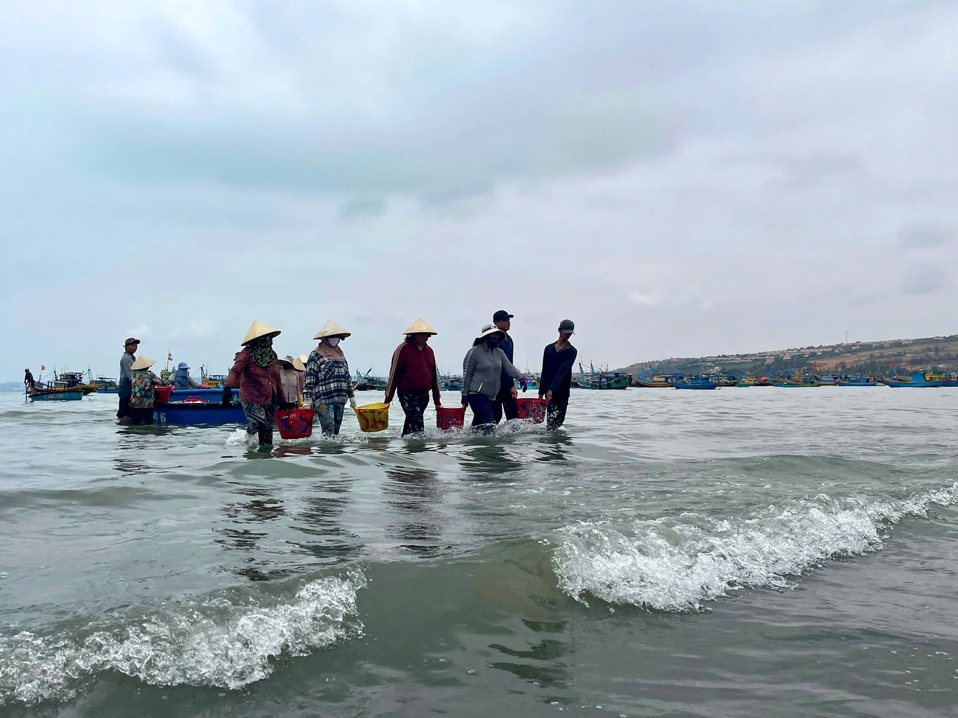 Ông Huỳnh Văn An, một người dân khiêng cá thuê tại vùng biển Mũi Né chia sẻ: Mỗi giỏ nhựa đựng có trọng lượng 15 kg cá, khiêng mỗi giỏ tôi được trả công từ 3.000 - 5.000 đồng, mỗi buổi sáng thu nhập được 400.000 - 500.000 đồng.