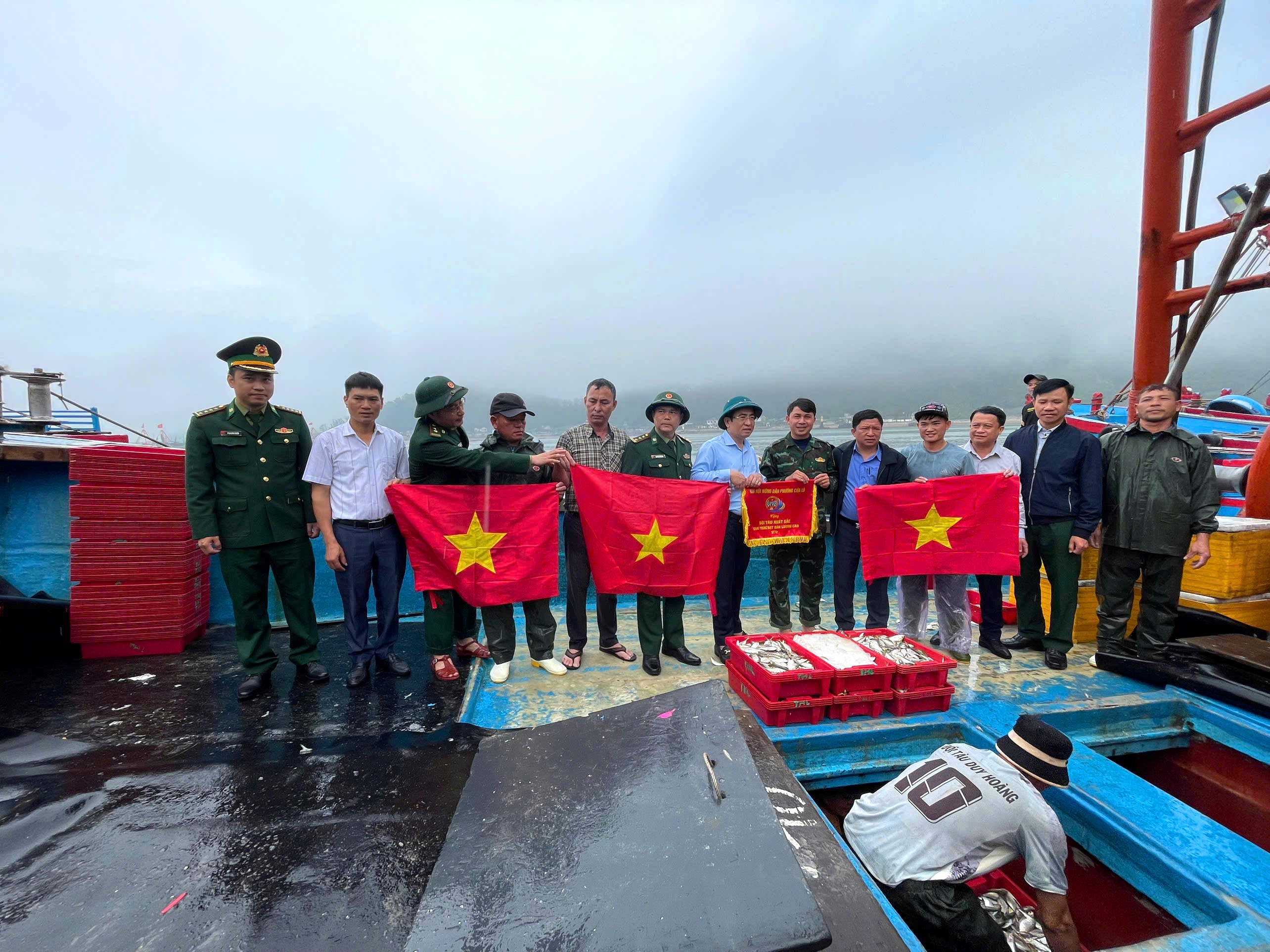 Lãnh đạo phường Cửa Lò, Đồn Biên phòng cửa khẩu cảng Cửa Lò - Bến Thủy... chúc mừng và trao tặng cờ động viên đội tàu của ngư dân Trần Văn Lưu