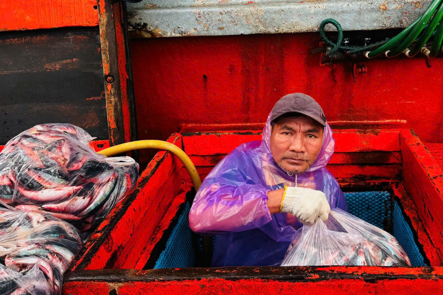 Không chỉ riêng anh Cường, nhiều tàu cá khác cũng trúng đậm các loại hải sản. Từng khoang cá tươi nhanh chóng được đóng vào bao, bán cho các thương lái.