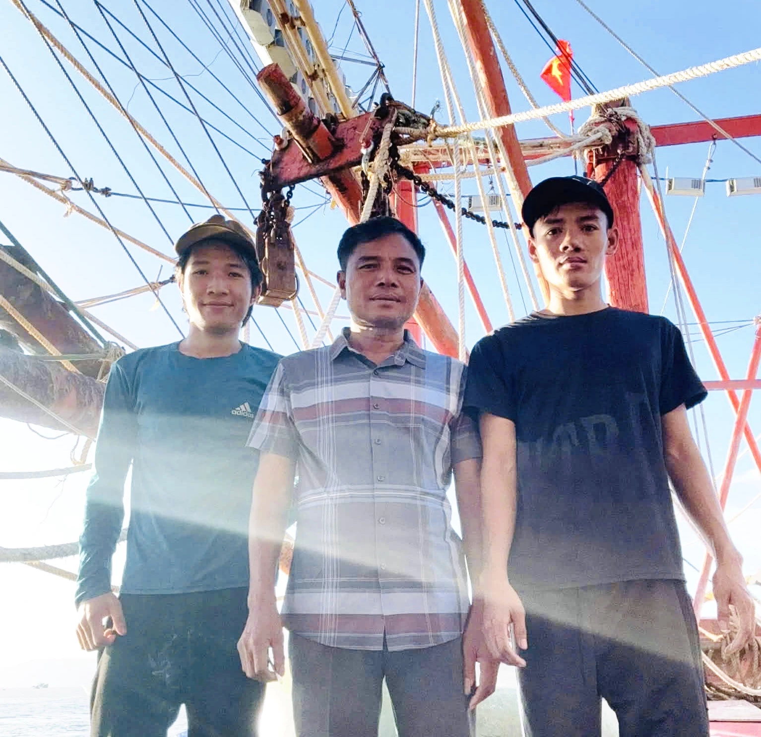 Ông Hồ Đăng Vỏ (người ở giữa) cùng hai con trai trên tàu cá QB-92981-TS - Ảnh: T.L