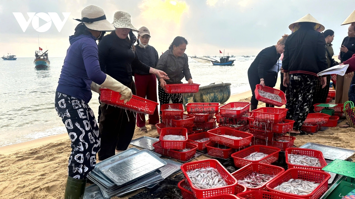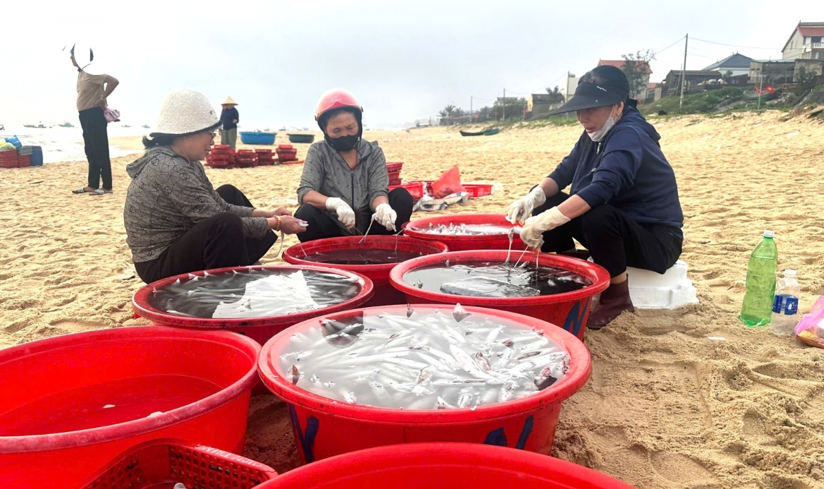Từ sáng sớm, khu vực chợ cá ven biển xã Nam Trạch, tỉnh Quảng Trị rộn ràng tiếng máy nổ của tàu thuyền, tiếng tiểu thương gọi nhau bán mua hải sản khi thuyền cập bờ. Hàng chục thuyền nhỏ nối đuôi nhau cập bờ biển bãi ngang mang theo nhiều mực tươi, cá cơm và nhiều loại hải sản khác.