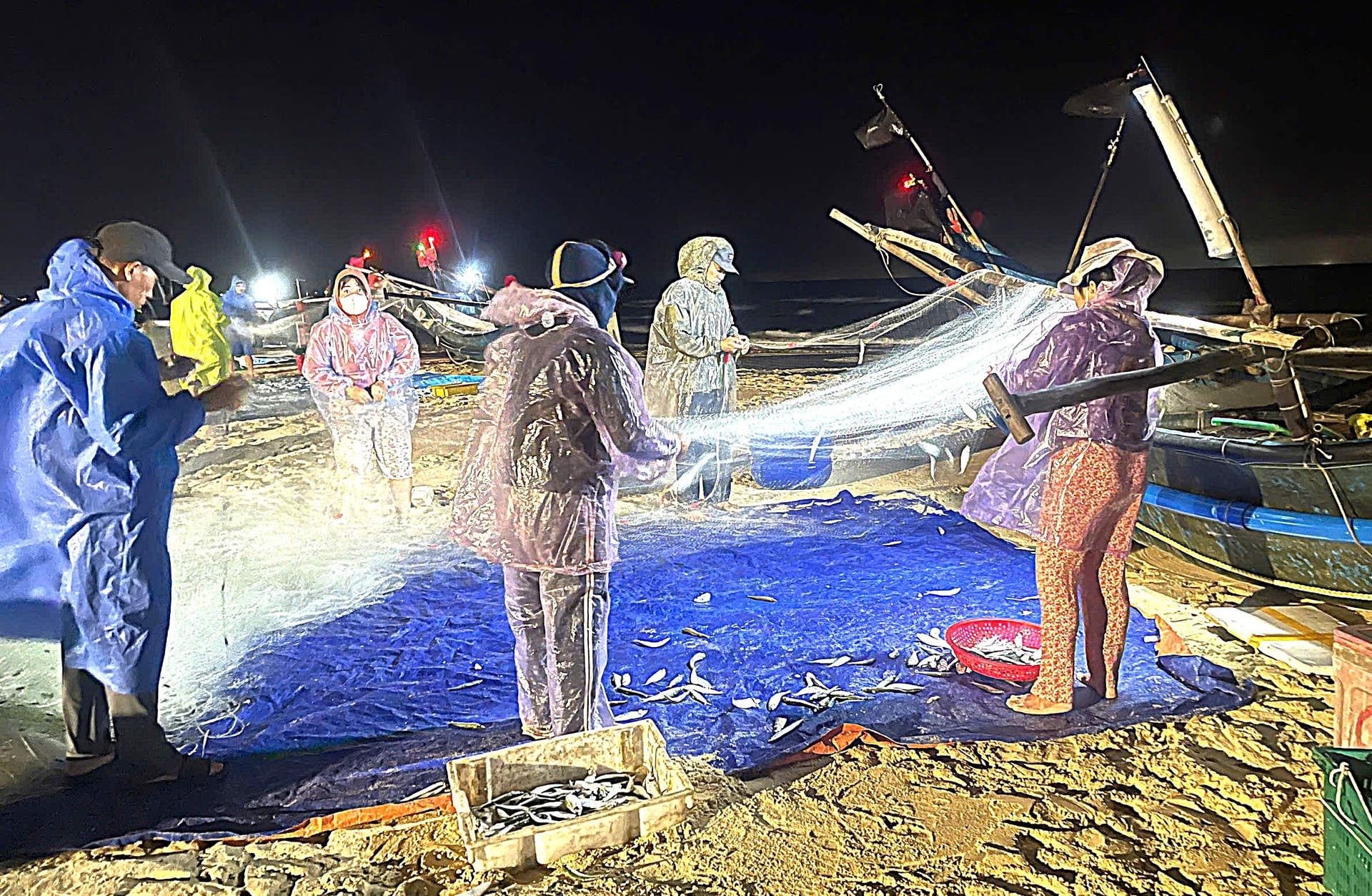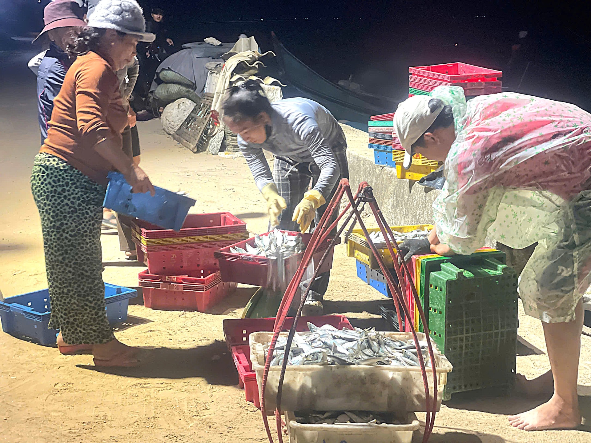Cách đó không xa, ông Hoàng Ngọc Thịnh, khối phố Hòa Trung cùng bạn thuyền của mình đang tranh thủ gỡ cá để kịp cân cho thương lái. Dưới ánh đèn pin, những con cá trích tươi, căng tròn lấp lánh ánh bạc phản chiếu dưới ánh đèn tạo thành những đốm sáng li ti như sao rơi trên cát.