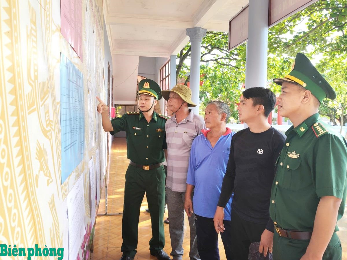 Các ngư dân được Bộ đội Biên phòng giới thiệu về các ứng cử viên bầu cử đại biểu Quốc hội khóa XVI và đại biểu Hội đồng nhân dân các cấp. Ảnh: Lê Văn Chương
