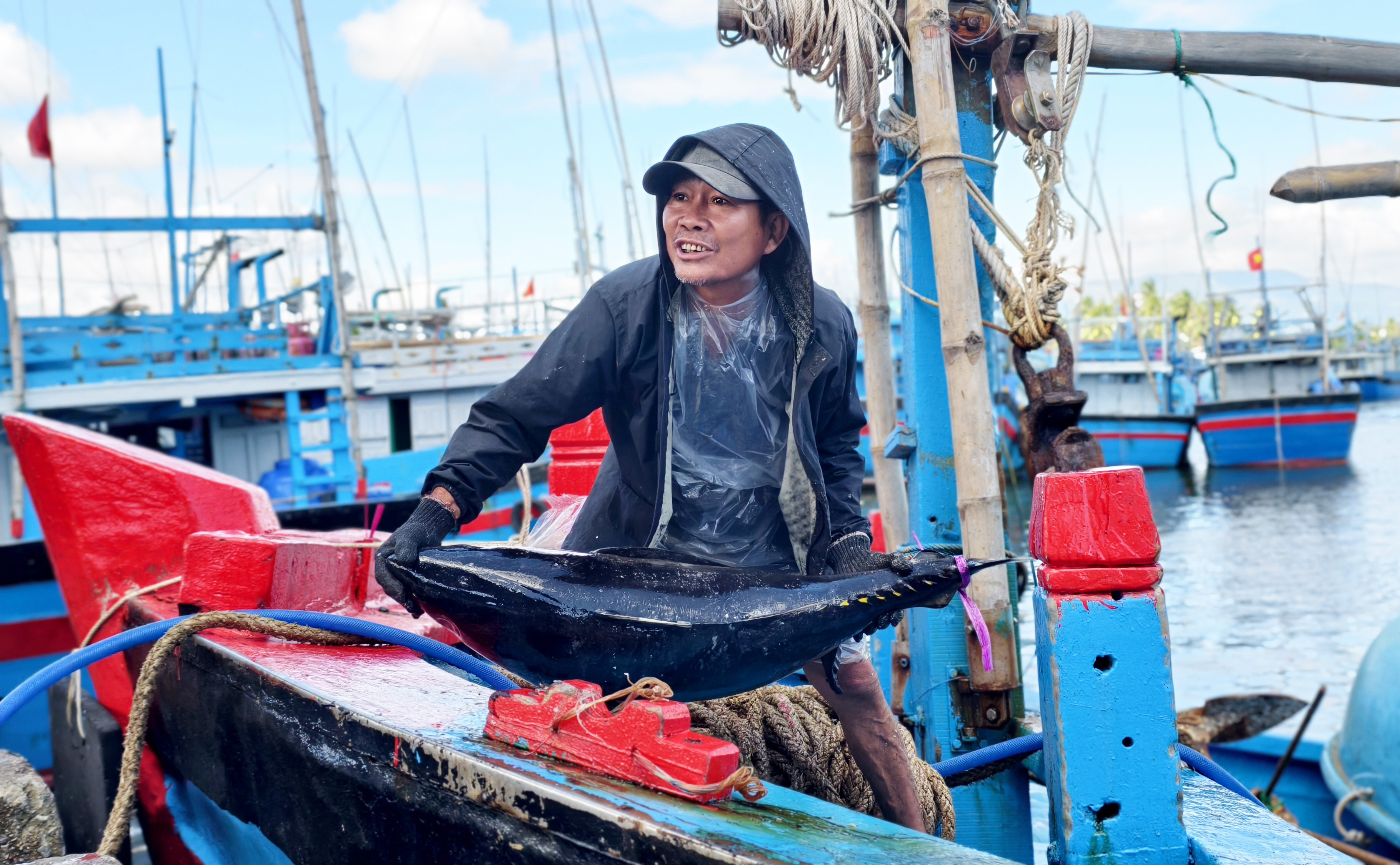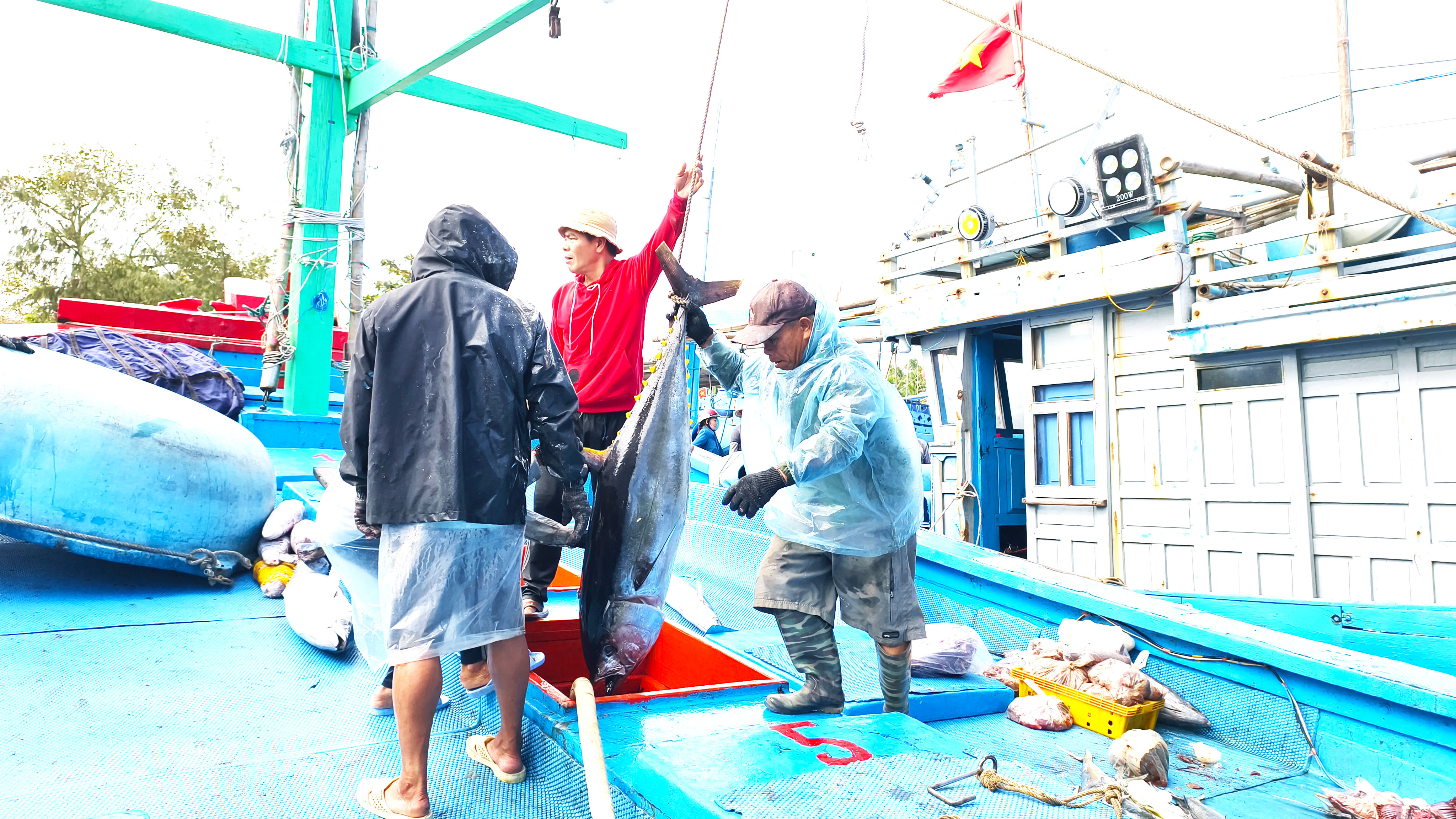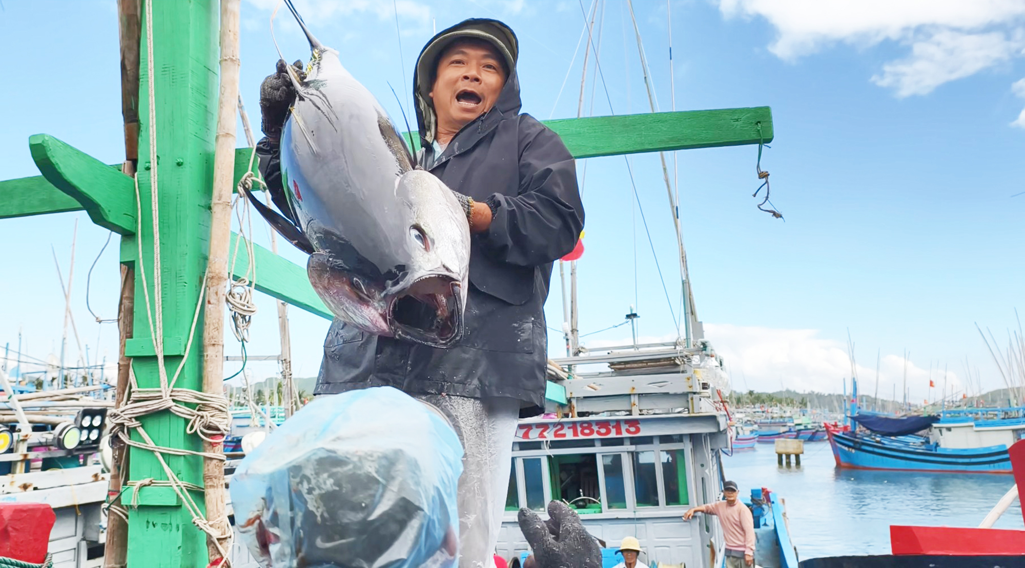 Vừa hoàn thành chuyến biển kéo dài 25 ngày trở về, ngư dân Trần Thân (51 tuổi, chủ tàu BĐ 95536 TS; phường Hoài Nhơn Bắc) báo tin, tàu ông trúng được 55 con cá ngừ đại dương, trọng lượng khoảng 2,3 tấn. “Có đêm, tàu tôi câu được 4 tạ cá, anh em phấn khởi lắm. Đặc biệt, chuyến này, tôi câu được 1 con cá ngừ mắt to nặng 1,1 tạ, đây là điều rất hiếm gặp trong nghề”, ông Thân kể.