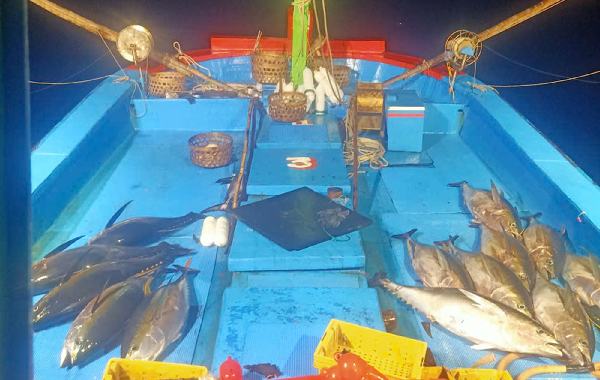 Một tàu câu cá ngừ đại dương trúng đậm mẻ cá hàng tạ chỉ trong một đêm hành nghề ngoài khơi. Ảnh: HUỲNH MỚI