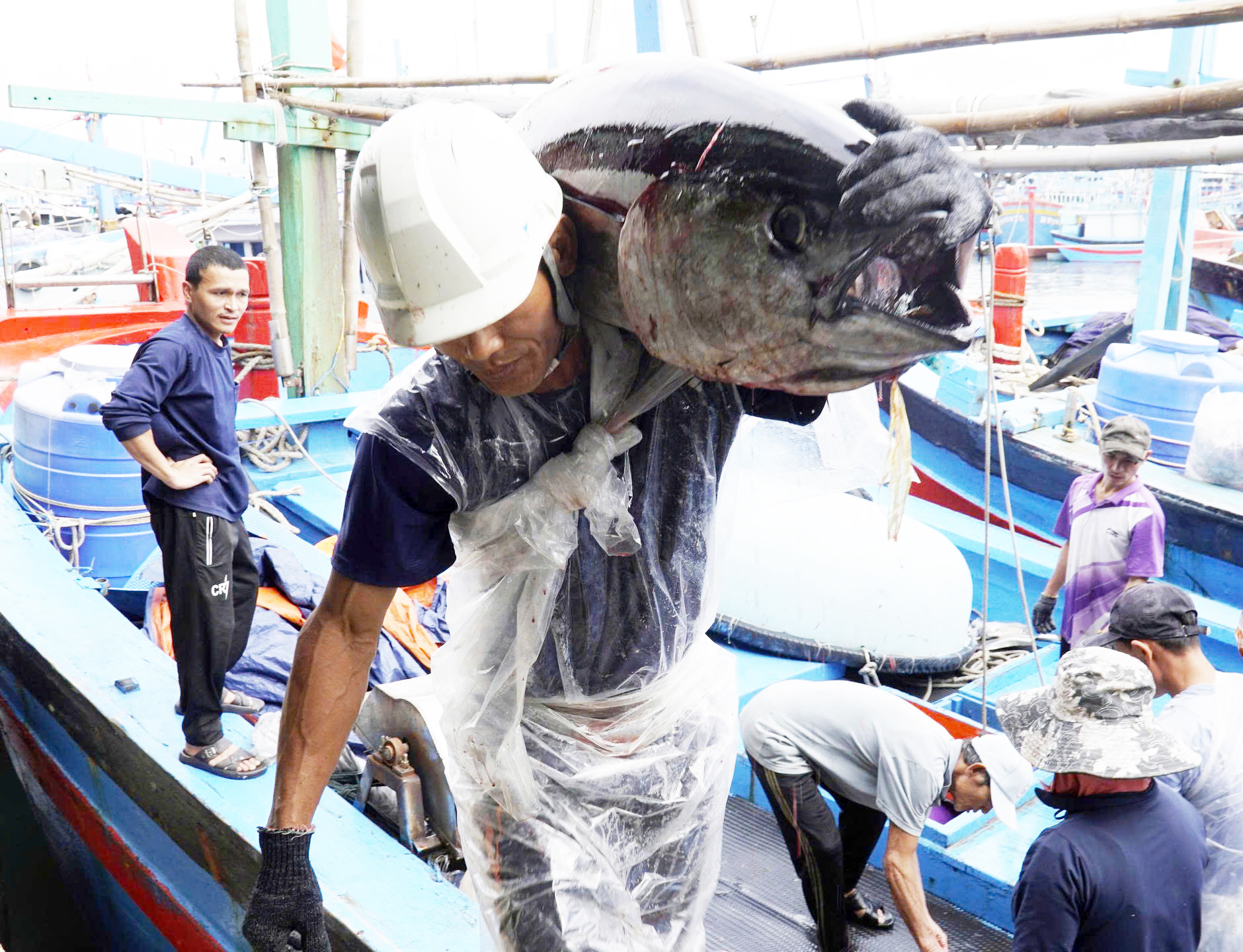 Cá ngừ đại dương được đưa về bờ, bán cho các thương lái kịp tiêu thụ trước Tết Nguyên đán. Ảnh: TUỆ LÂM