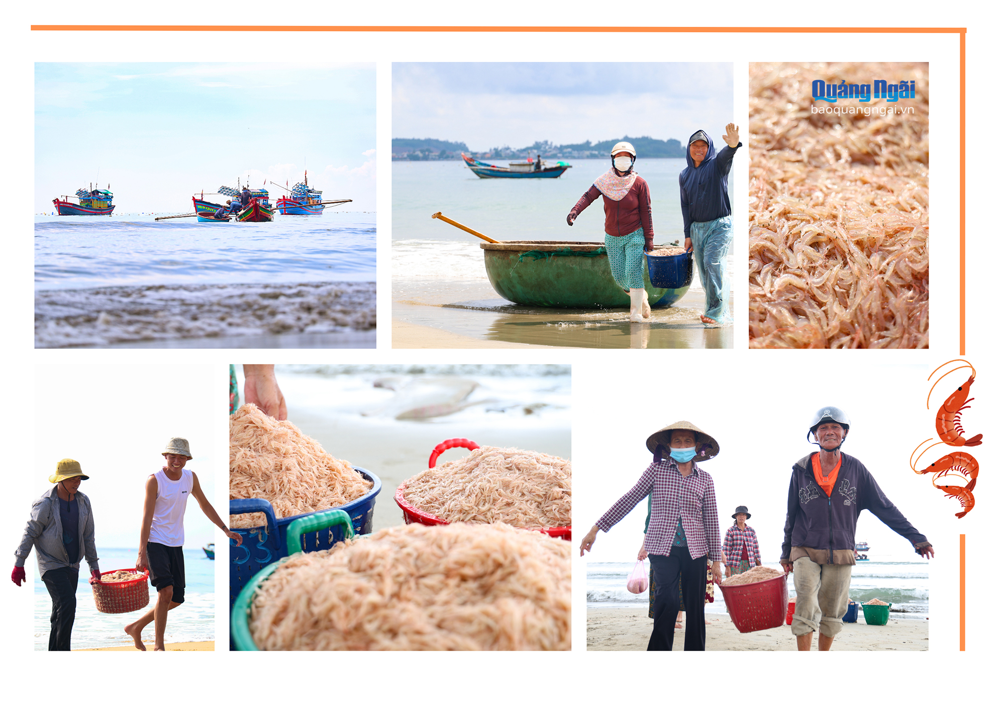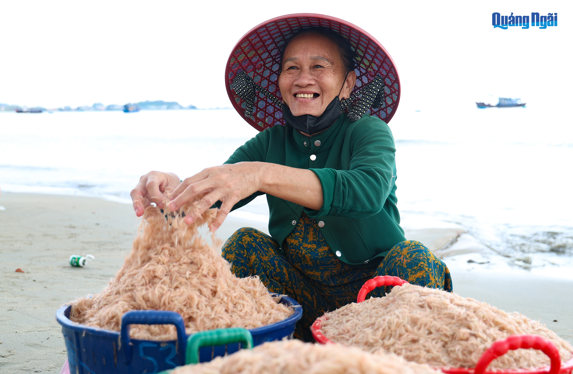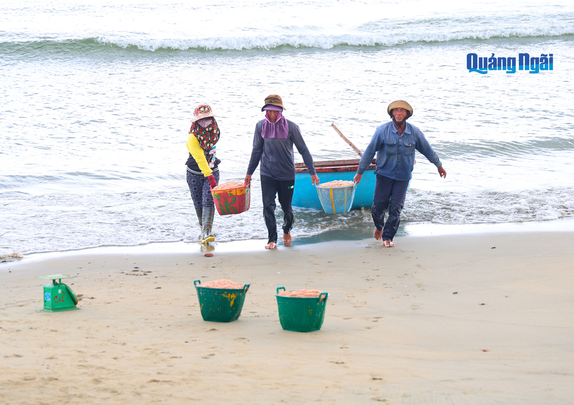 Những ngày này, từ sáng sớm, dọc các bãi biển ở xã Tịnh Khê, đã rộn ràng tiếng cười nói của ngư dân. Hàng chục chiếc thuyền nhỏ, cùng thúng nối đuôi nhau ra, vào bến liên tục trong ngày. Những giỏ ruốc đỏ au, tươi rói nhanh chóng được ngư dân chuyển lên bờ bằng thúng để cân, bán cho thương lái.
