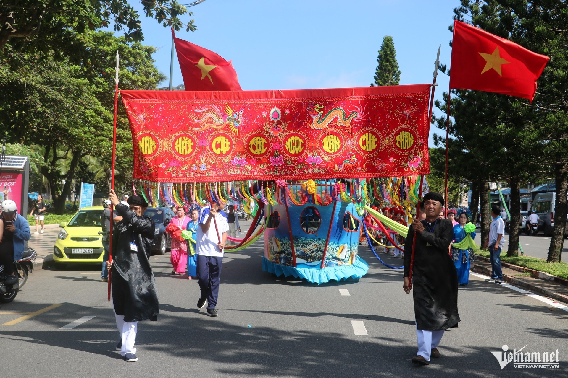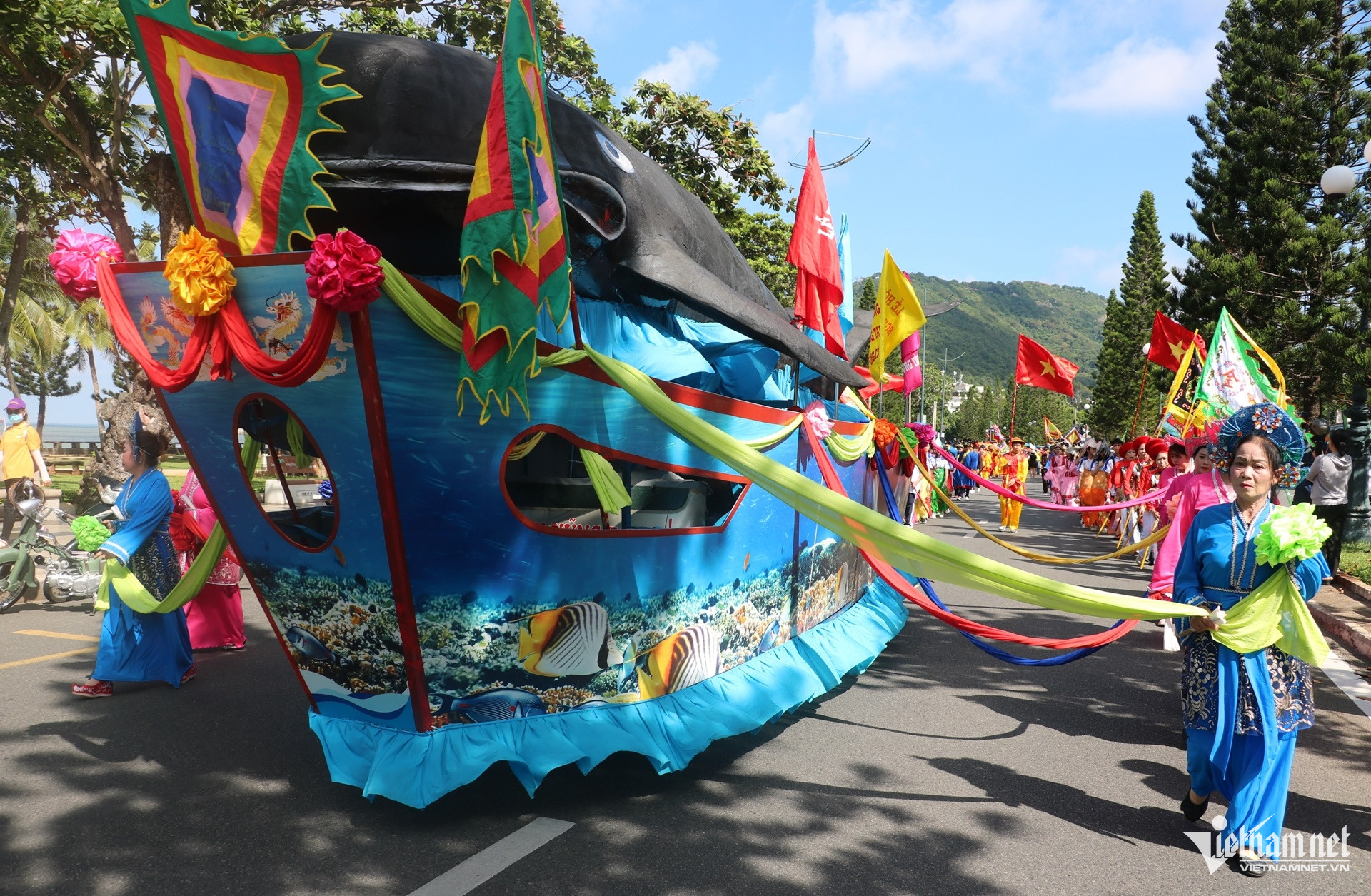 Hình tượng cá Ông được đoàn đưa rước đến Đình thần Thắng Tam để thực hiện nghi lễ chính. Ngư dân gửi gắm niềm tin, cầu mong bình an và mùa biển bội thu. Ảnh: Q.H