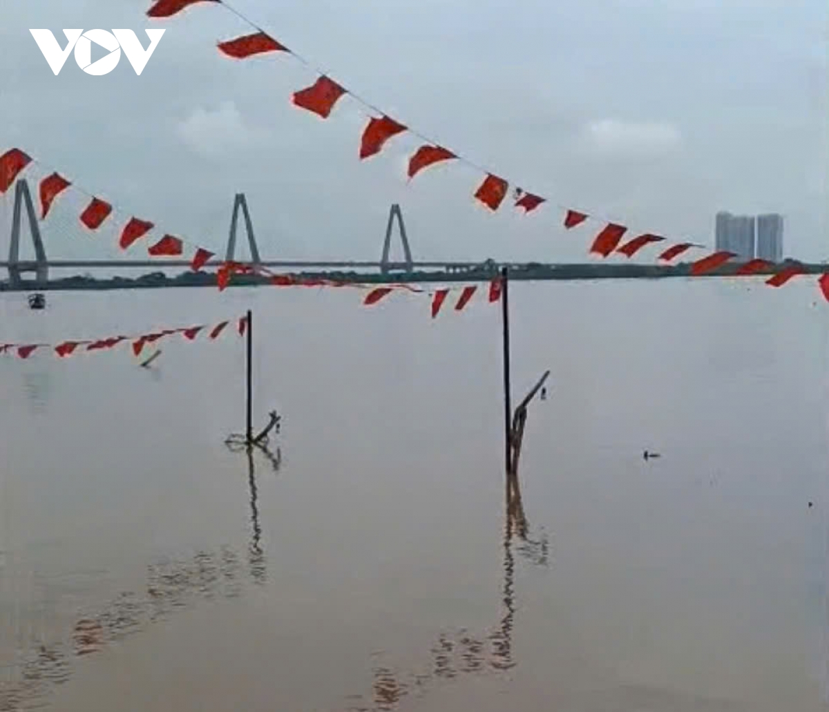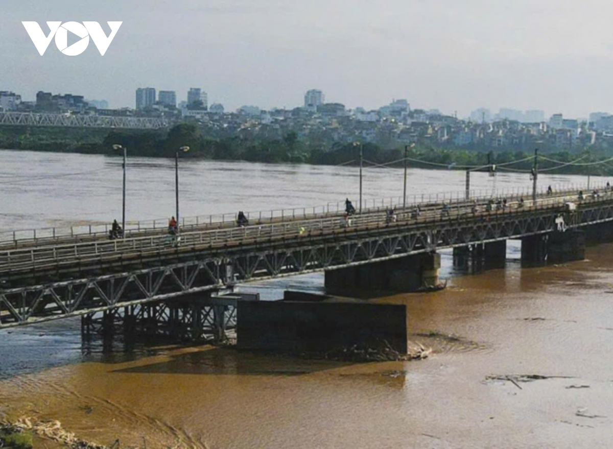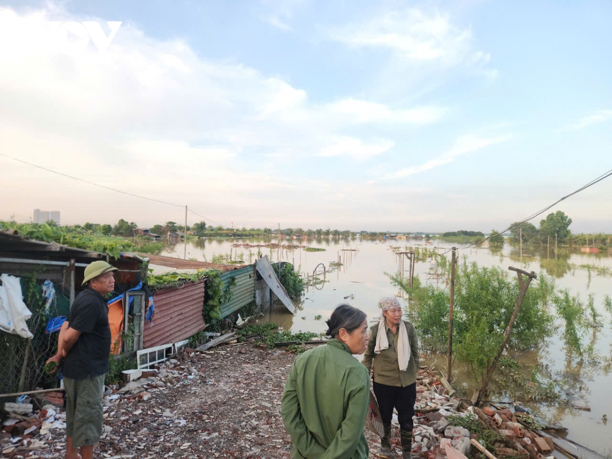 Ghi nhận của phóng viên chiều 2/10 tại khu vực sông Hồng đoạn qua cầu Long Biên và Chương Dương, nước lũ dâng cao, nhiều ngôi nhà dưới chân cầu bị ngập sâu, có nơi nước đã chạm gần tới mái. Khu vực bãi giữa vốn là nơi cư trú của nhiều hộ dân nhưng bị cô lập hoàn toàn.