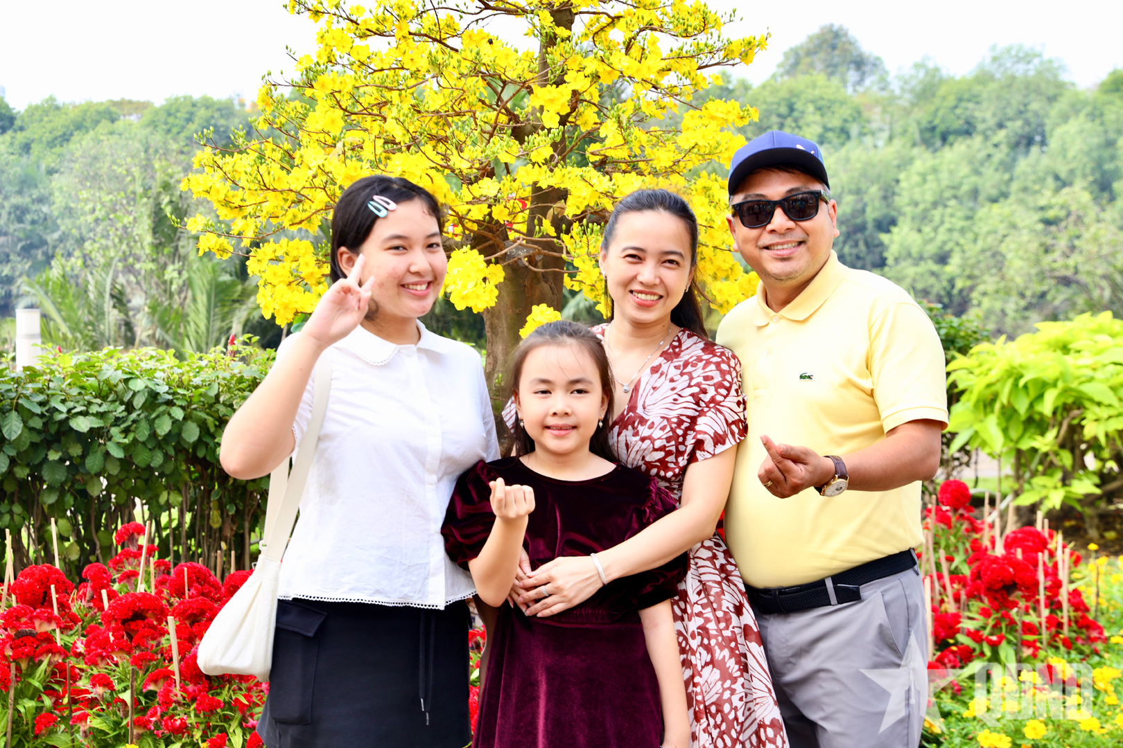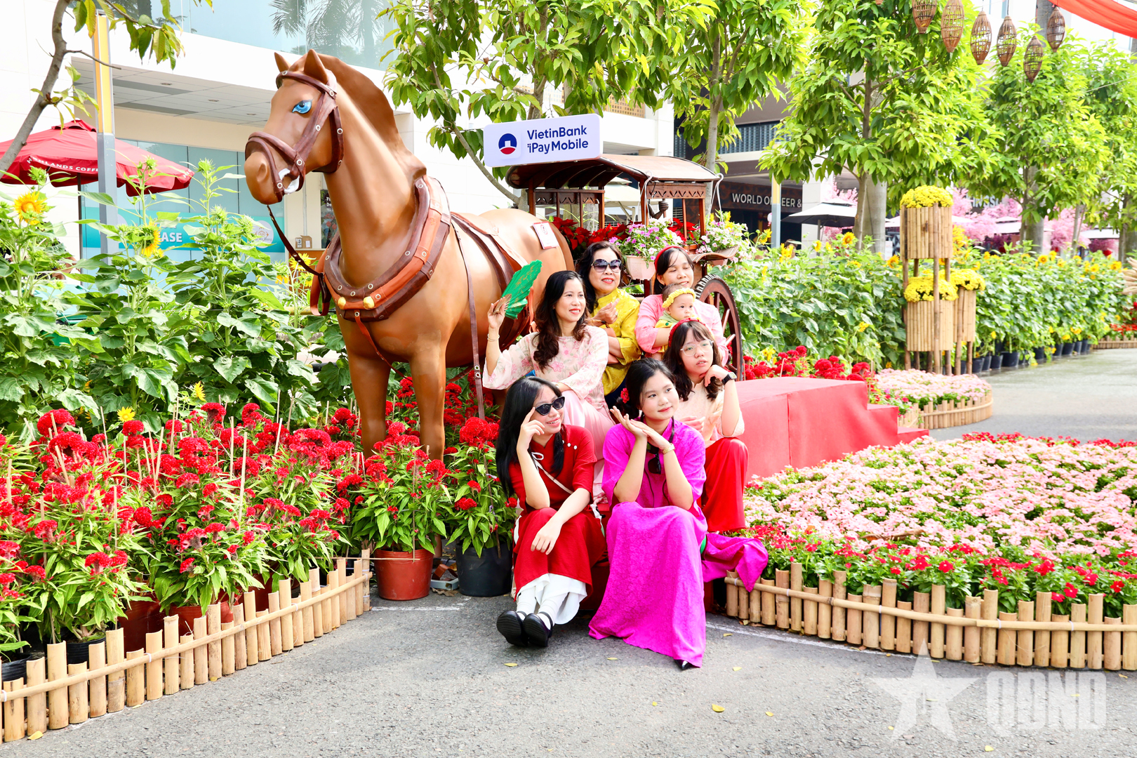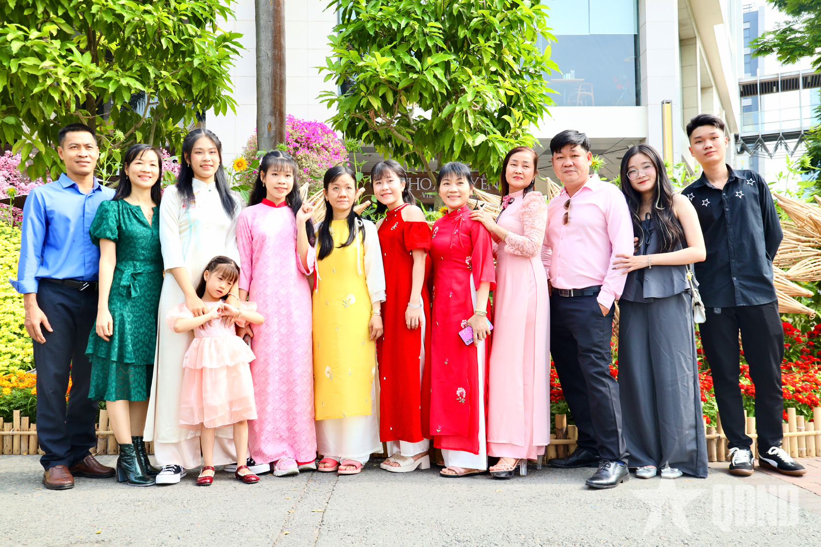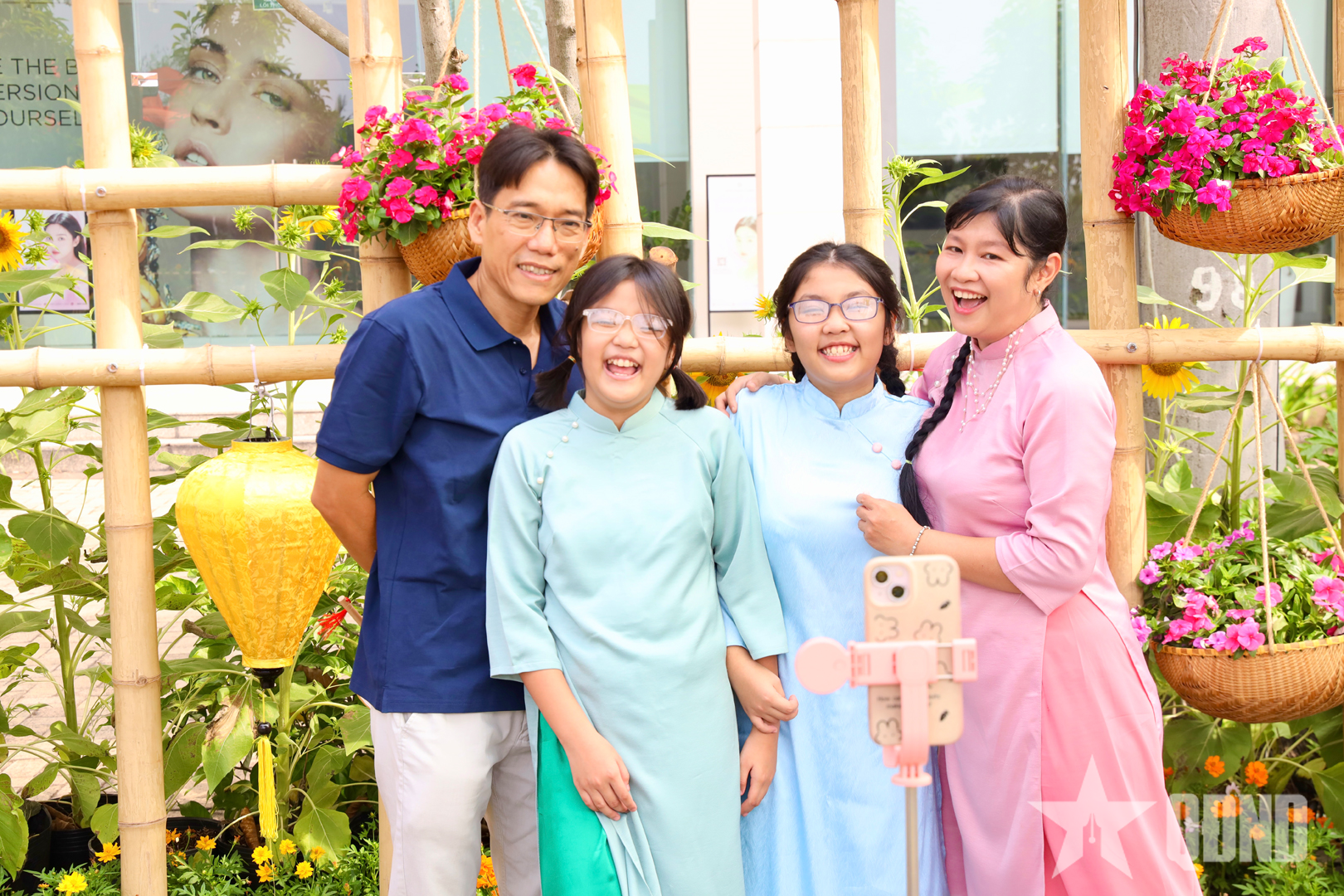 Nhiều gia đình, nhóm bạn trẻ lựa chọn diện áo dài, lưu lại những khung cảnh rực rỡ sắc hoa và ánh đèn trang trí.